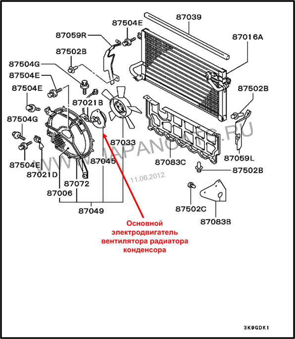 При смене основного вентилятора оказалось, что электродвигатель дополнительного тоже не работает. Разборка дополнительного элдвигателя показала что изношены до предела и подвисли щетки. Замена щеток, смазка – электродвигатель в работе без нареканий. Разборка-замена щеток-сборка трудностей не вызвала. Снятие элдвигателя, совместно с диффузором, производилась через низ, при снятом основном вентиляторе радиатора кондея.