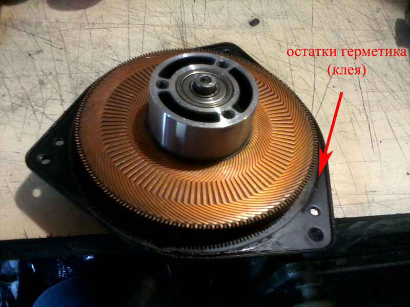Снимаем съемником, помогая отверткой, корпус элдвигателя. Он держится за счет герметика (клея) и прижимной магнитной силы постоянного магнита находящегося внутри элдвигателя: