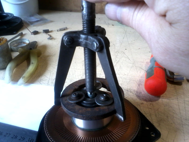 Сняв корпус выпрессовываем ротор с неподвижного вала, можно при помощи набора шайб и того же съемника (по валу не стучать! металл мягкий):