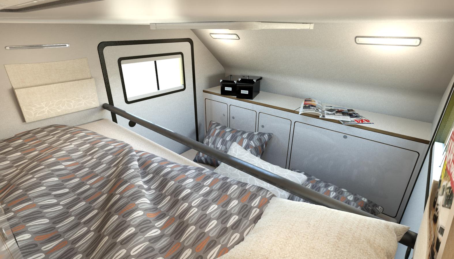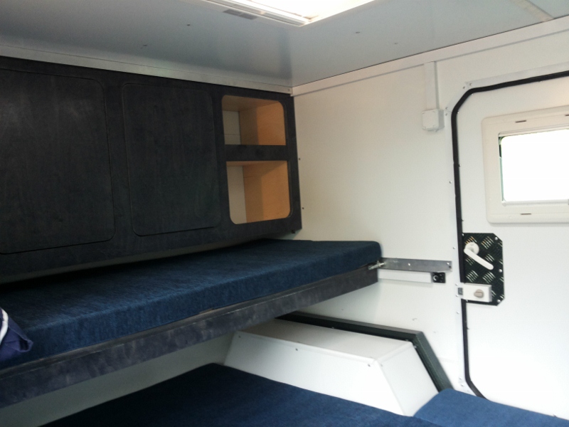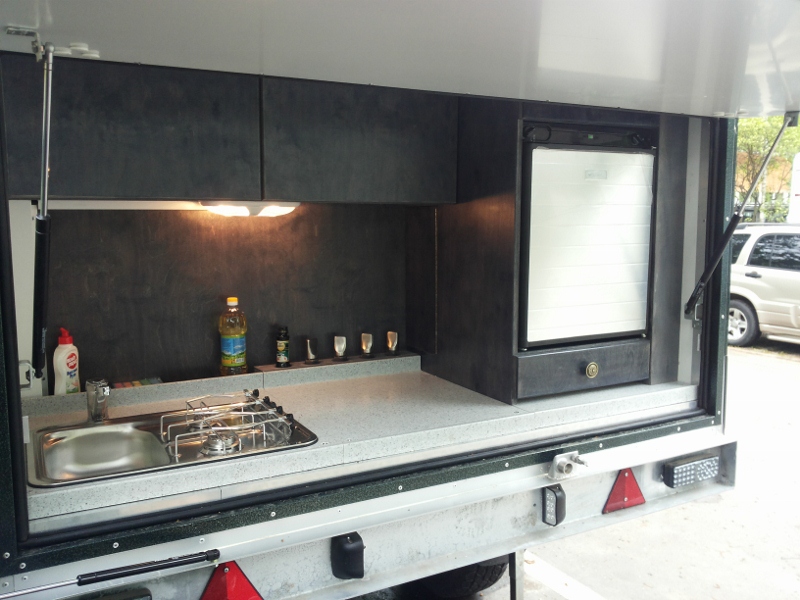 Мне кажется, что мы несильно отклонились от дизайнерского варианта. При этом «эска» получила мощную раму, независимую пружинную подвеску, каркасный утепленный (30 мм) кузов и почти максимальное оснащение: систему тормоза наката Knott, аккумулятор 100А/ч, инвертор Waeco 12/220В с пиковой мощностью 2400Ватт, бак для воды Fiamma на 70 литров, варочную панель на две конфорки с мойкой Dometic Smev, стационарный автохолодильник Dometic RF 60, работающий от 12/220В или от газа, а также салонный дизельный отопитель Eberspacher. Люк и окна имеют шторки и анти-москитные сетки.