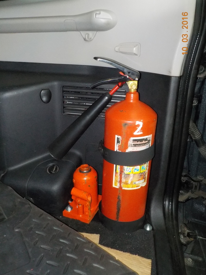 В этом углу есть небольшой кусочек пластикового пола. Вместо него устанавливается металлический, под ним живут теперь пара закладных гаек М8. После этого, на пластину приваривается крепление огнетушителя (в любом пожарном магазине), и штырь М8 для крепежа домкратика. К боковому пластику такие гири крепить нельзя - все вырвет. Да и место это ходовое, а, именно - конфликт интересов электриков (там косы, разъемы и проч.), кондиционерщиков и др. Если полезут туда, то уж пару болтов М8 из пола открутить смогут.