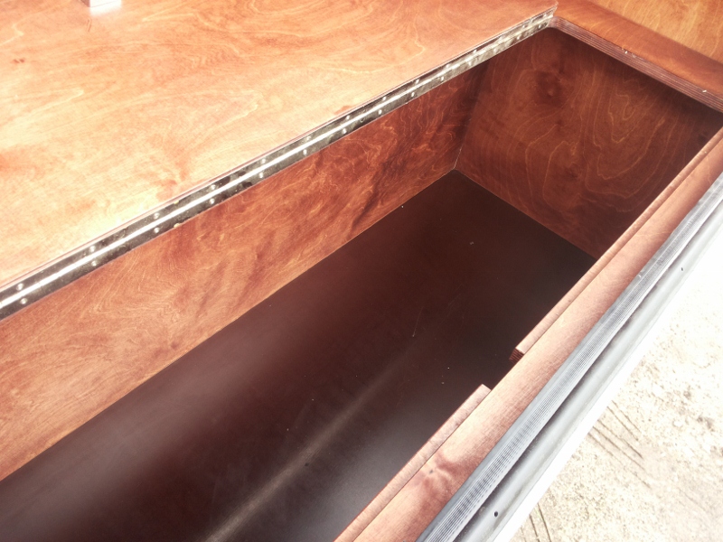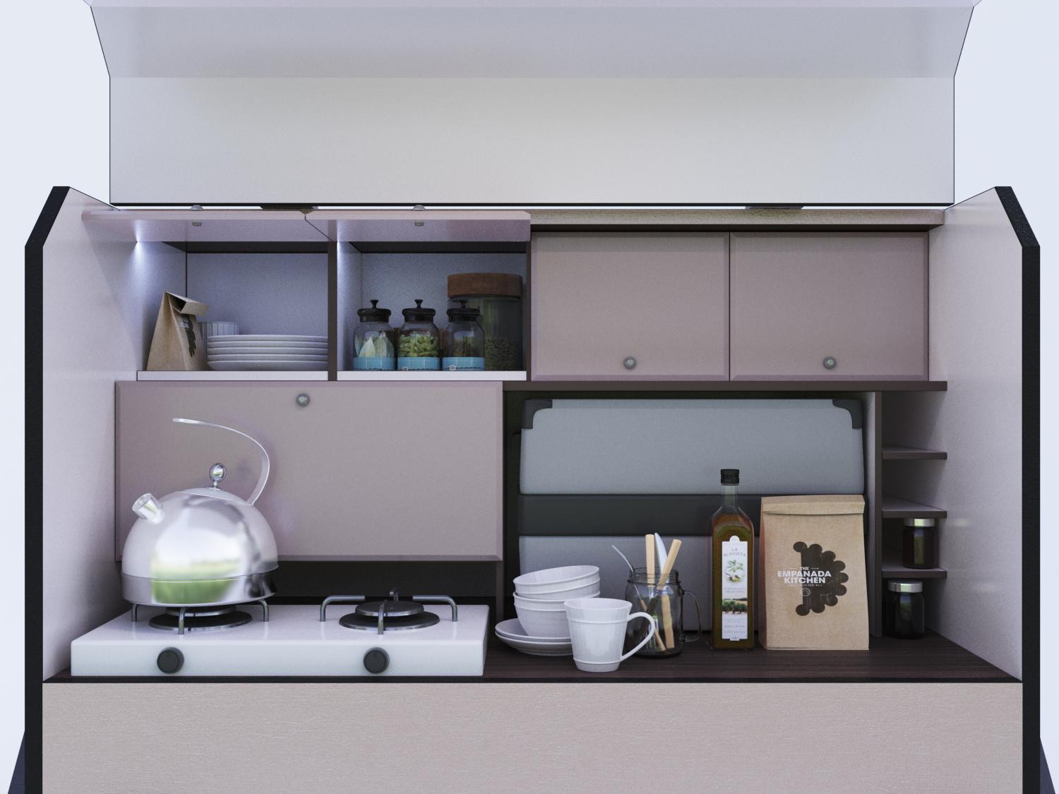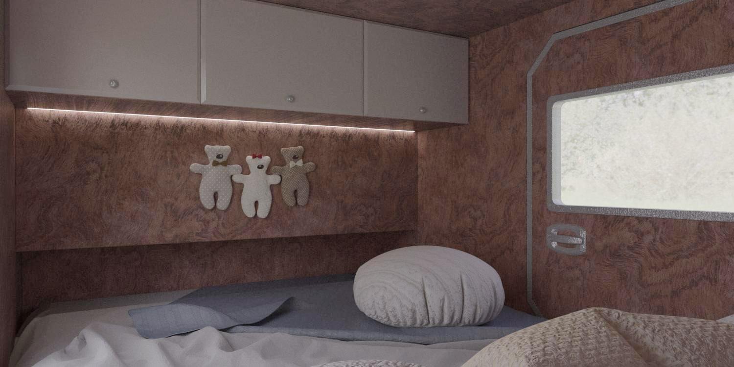 Кузов разделен на два отсека. В спальном имеется матрас размером 2000х1400х80 и предусмотрено место для размещения полок для вещей и мультимедийной системы. В грузовом отсеке, который, в свою очередь, также разделен на два отсека, можно разместить необходимое кухонное оборудование (холодильник, варочную плиту и выносную мойку), а также установить аккумулятор, автономный отопитель, бак для воды, инвертор и... В общем, много чего, благо, места хватает.