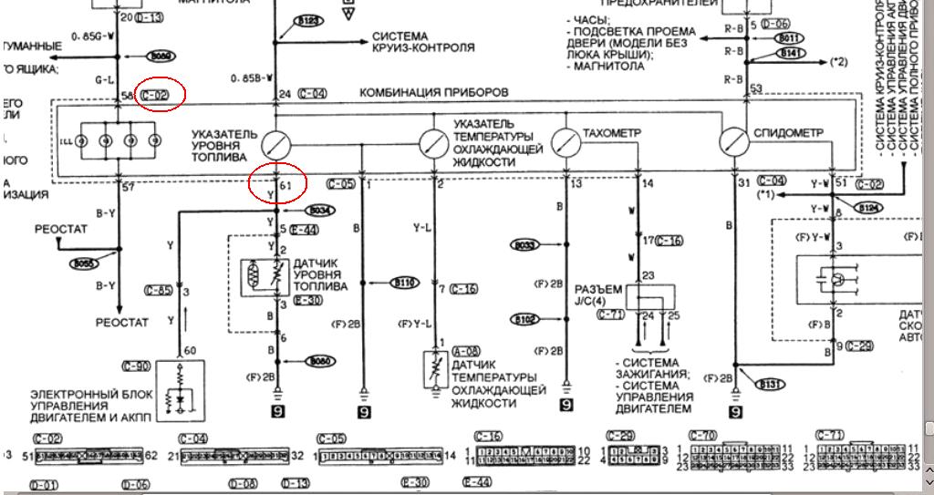 Короче. Вытащил колодку из торпеды, одел на неё приборку, в контакт, отвечающий за топливо (судя по картинке), воткнул кусок провода, к которому приделан 50-омный резистор (2х100 параллельно). Включаю зажигание - пофиг, стрелка молчит. Эта нога на землю не звонится. Судя по всему не она...