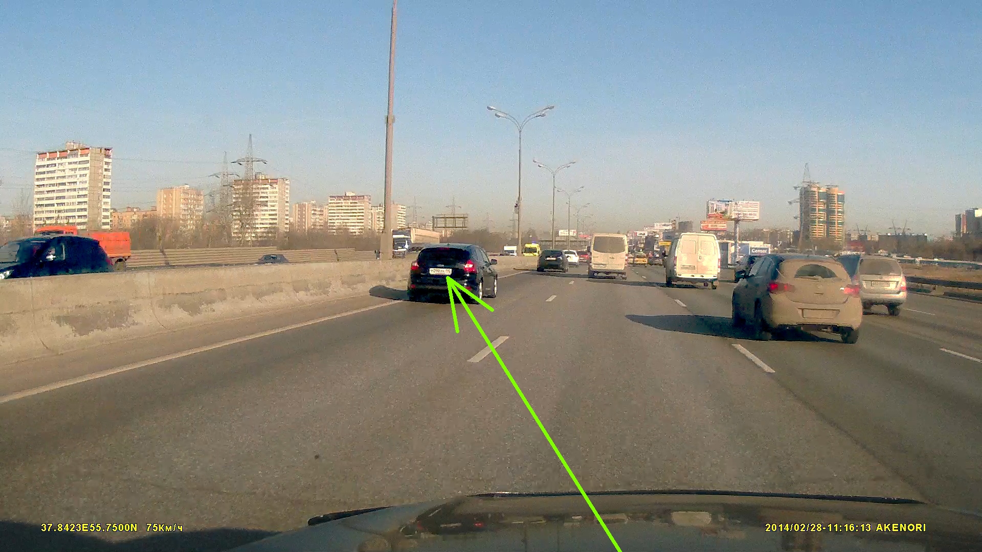 Последнее примечание касается дизлов,тама граница резкости снижается.С видео возиться не хо,но вот кадр,тама форд немногим быстрее мну ехает,т.е. суммарная скорость примерно ок.0км/ч,погода неплохая,стекло грязное и зажигалка.Это практически предел(на видео немногим лучЧе видно) Но я в принципе-то про съёмку в тёмное время суток,здесь дела намногим хужее