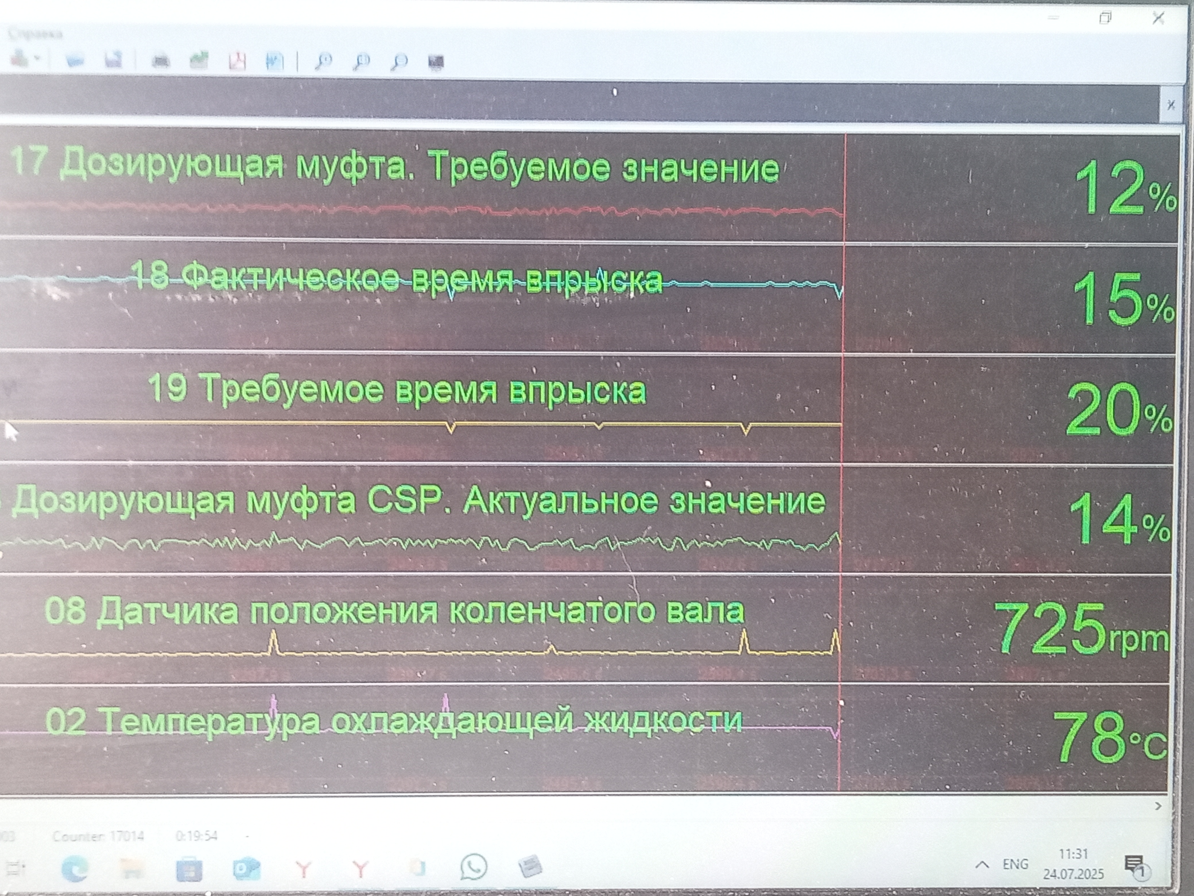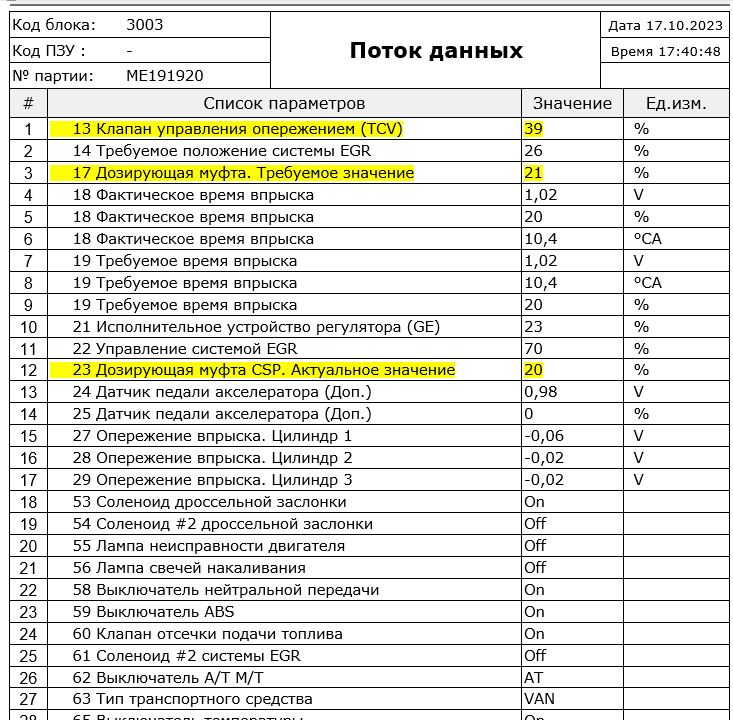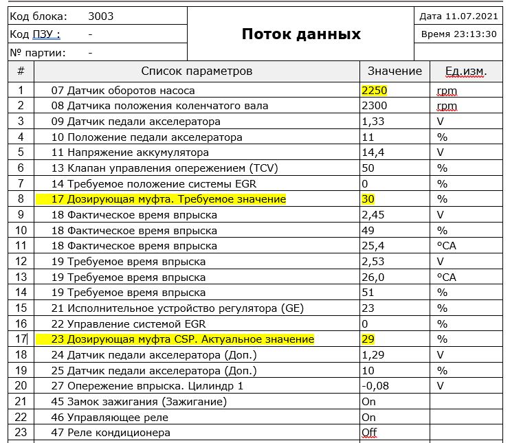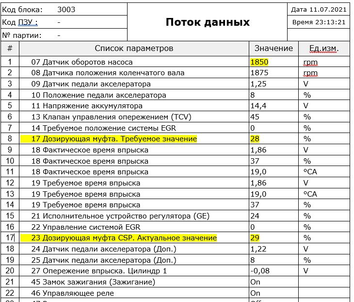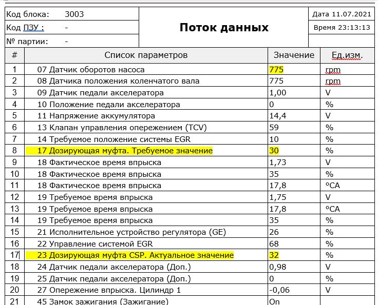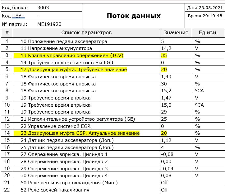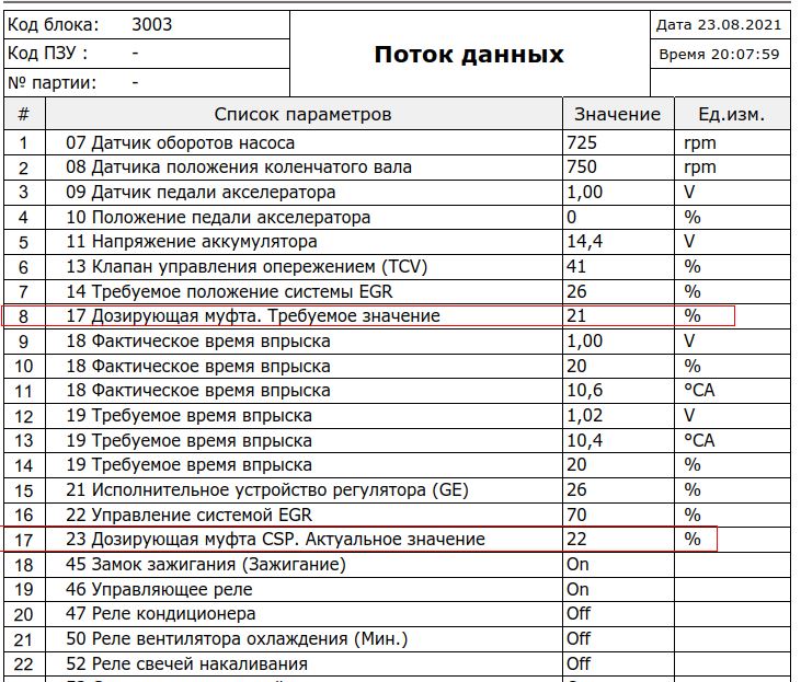 1. Хочется выть и ругаться матом от этих скринов с полным перечнем параметров, выведенных на контроль. В первом приближении достаточно всего пяти: положение дозирующей муфты (заданное и фактическое), время впрыска (требуемое и фактическое), плюс температура охлаждающей жидкости. Ну, можно ещё обороты двигателя. Остальные параметры могут потребоваться при поиске неисправностей. Чтобы понять состояние ТНВД в общем и целом, хватит и этого.