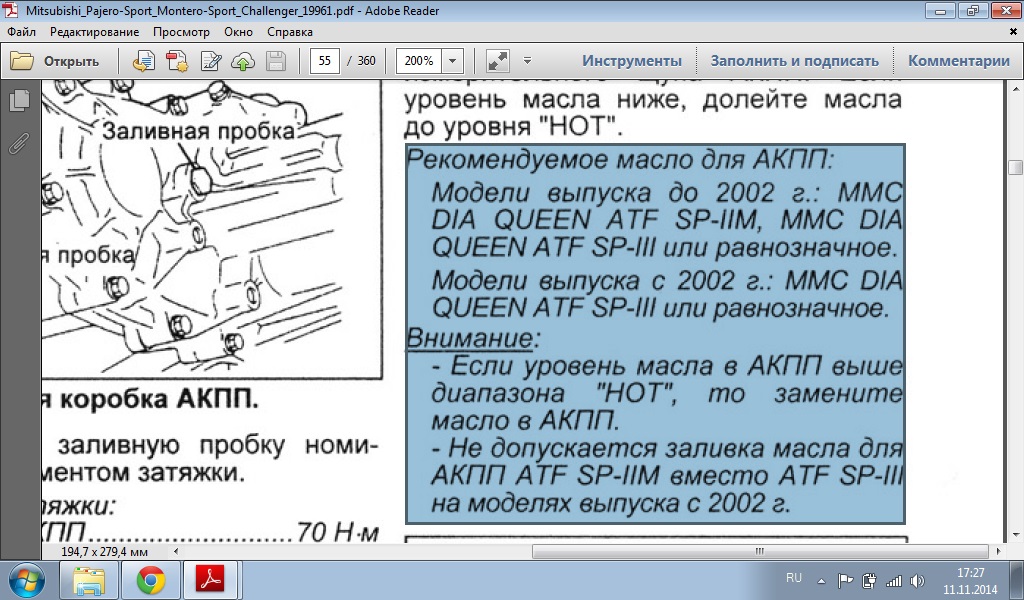 Писал больше года назад, в итоге залил тогда Шеврон SP3 и заменил фильтр. На сегодняшний день пробег на этом масле 32000 км, коробке не поплохело. Тысяч через пять очередная замена. Так что бред про незаменимость оригинала. Главное что бы по спецификации было SP3 и не паленое. Кстате, когда масло покупал, продавец сказал что этот Шеврон очень популярное масло и его берут именно для мицуб и корейцев.666717 писал(а):Подскажите кто в курсе, решил заменить масло в акпп, нашел ATF SP III производства Хундай, оригинальное масло для корейцев. Можно ли его лить в коробку паджеро? Коробка у меня типтроник.