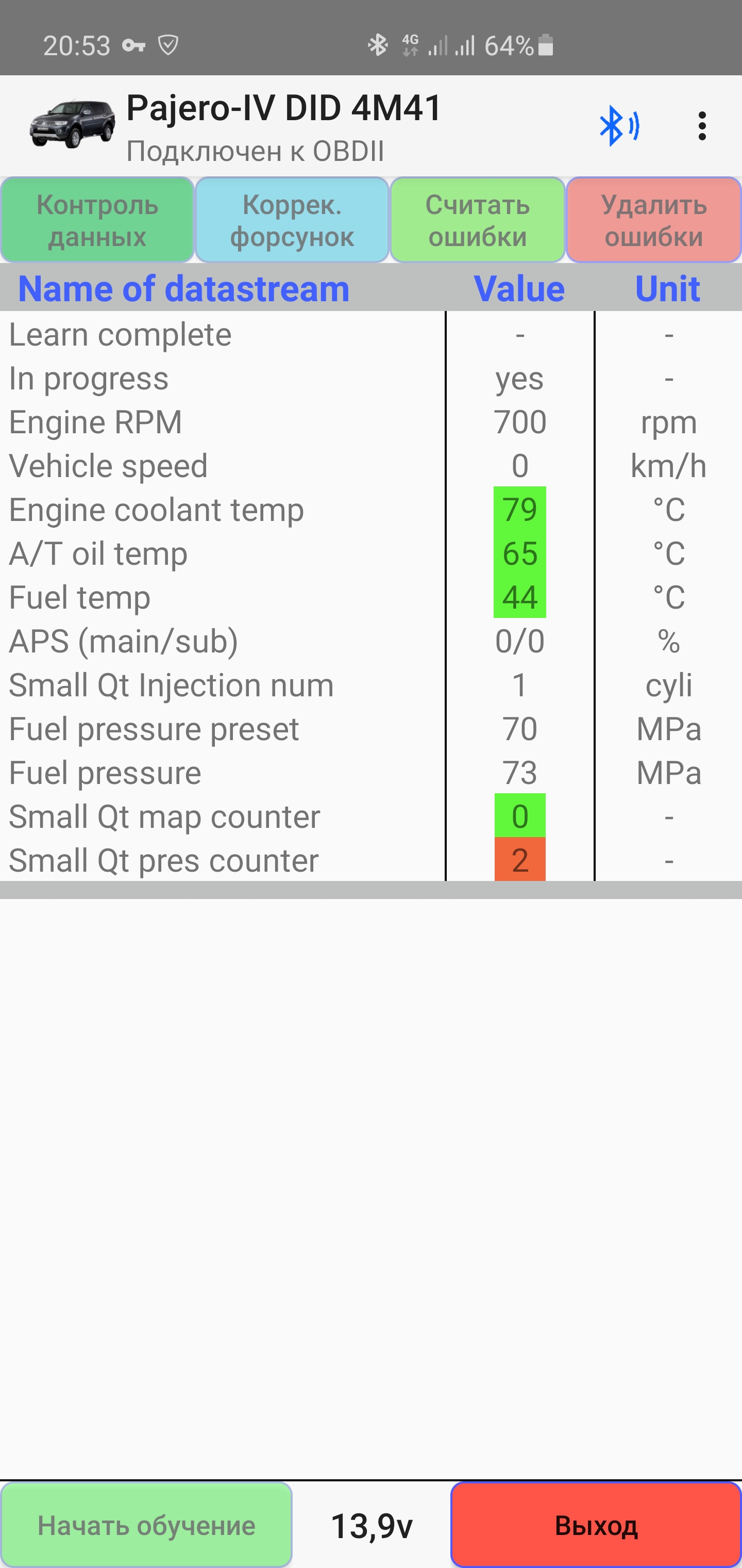 Доброе утро паджеро 4 8 года. Не проходит обучение малому впрыску проходит где то 3 этапа и потом остнавливается.в последней строчке 1 2 3 красными. Где-нибудь можно прочитать подробнее или кто то модет объяснить? Инициализацию клапана делал. Тест на утечки 135 развивает.