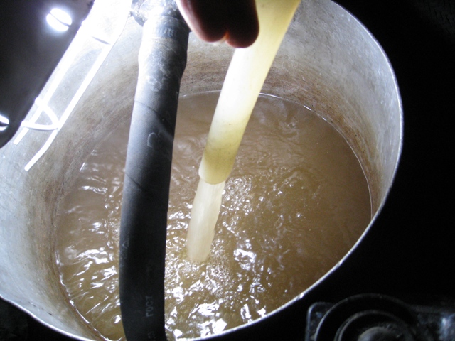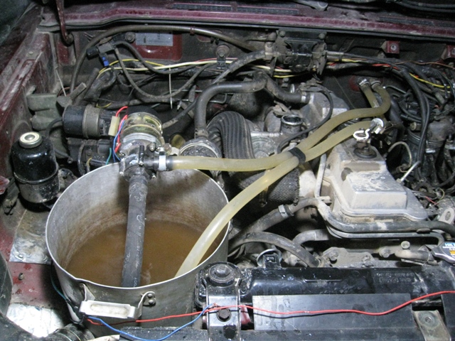 3. Вытаскиваю термостат. Беру насос от Газели, пару-тройку ведер, шлангов(назовем это "схемой") и выгоняю под давлением антифриз, подключая схему в систему охлаждения двигателя, заменяю антифриз раствором из следующего пункта, обраткой в отдельное ведро.