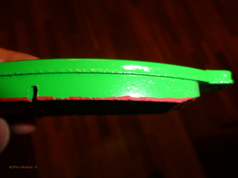 Сзади по левой стороне колодки стёрты практически в ноль и скрипун обломан, по правой стёрты неравномерно, как-то наискось - на внутренней колодке со стороны скрипуна остаток рабочей поверхности достаточно большой где-то 4-6 мм., скрипун цел, с противоположной стороны этой же колодки остаток рабочей поверхности минимальный. На наружной колодке все в зеркальном отображении. Почему так х.з., посмотрим как в этот раз сотрутся NIBK.