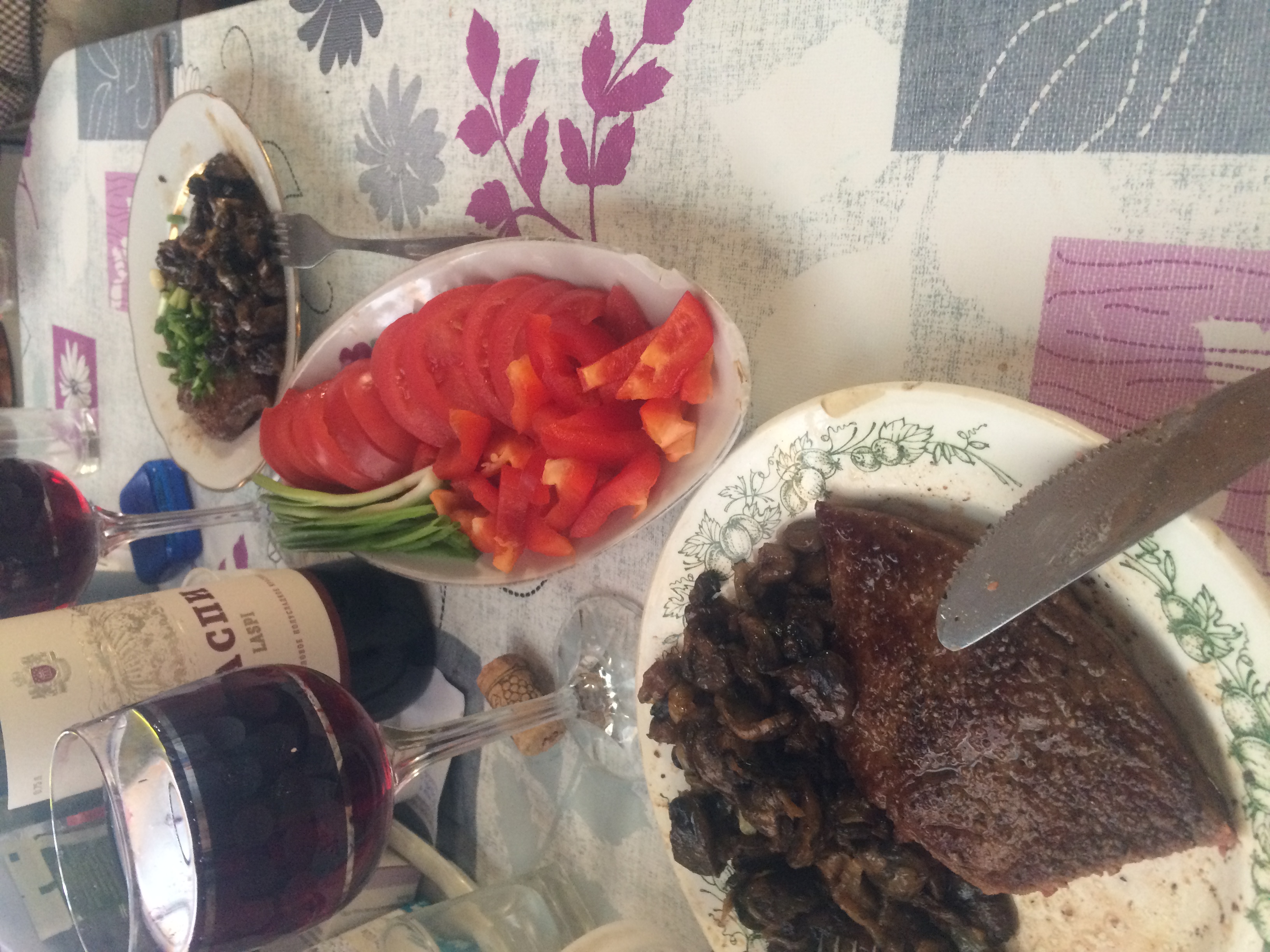 Пожарил стейки, из мраморной, брянской говядины. Гарнир из шампиньонов. Вино из Крыма. Обед удался.