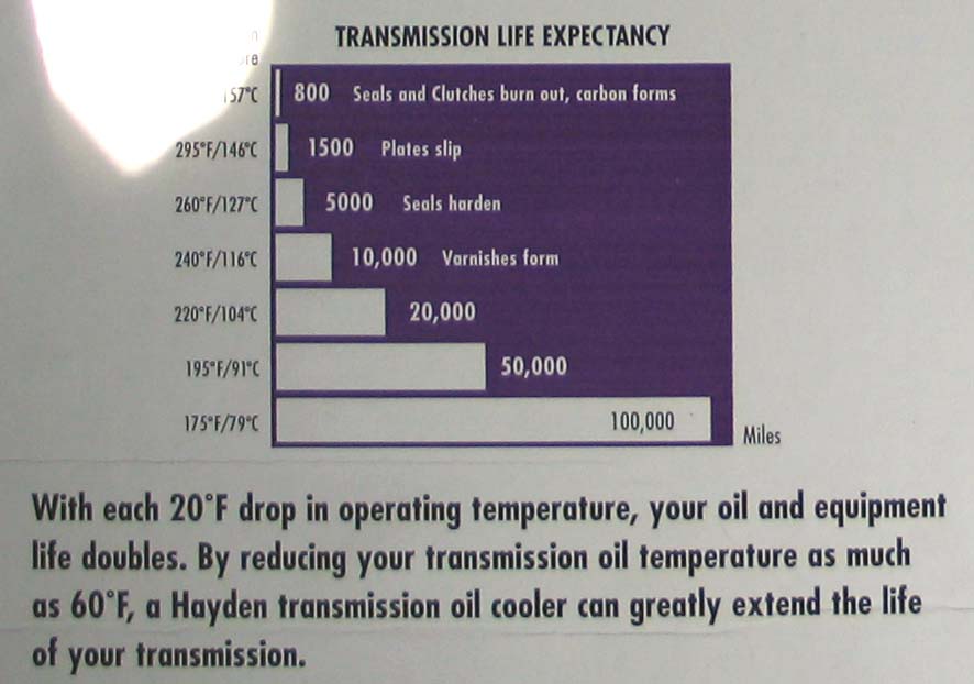 Насчет включения и отключения фена. Радиатор рассчитан на теплоотдачу для авто общим весом (GVW - Gross Vehicle Weight) в 22000 кг (хотя может и фунты - но все равно с запасом). Если уж он не остудит,то какие же тогда процессы протекают в АКПП при штатной системе охлаждения, которая у наших комплектаций для северного климата? Американская статистика говорит, что однократный нагрев АКПП до 140С сразу снижает ее ресурс с 60000 до 10000 миль.