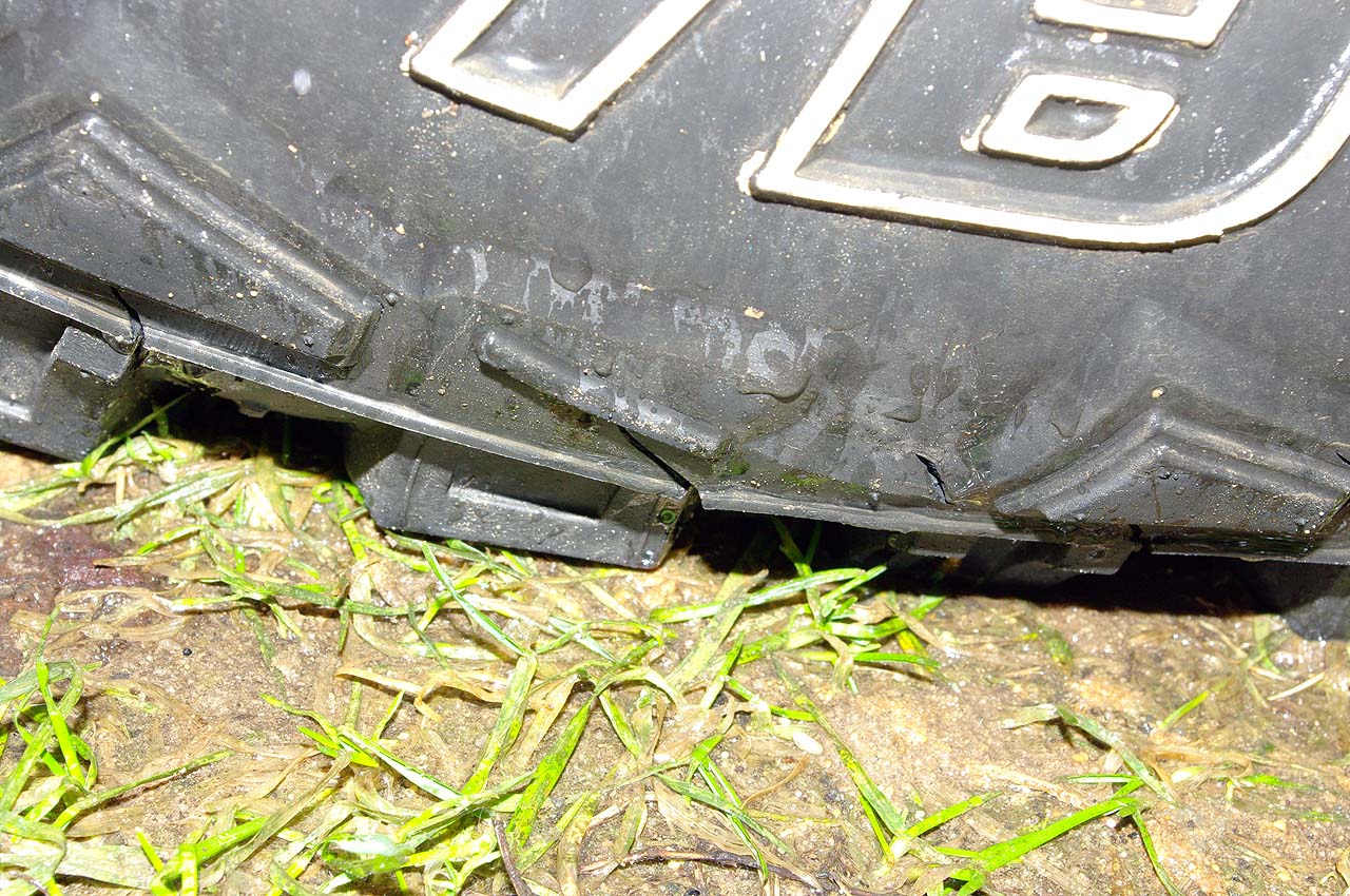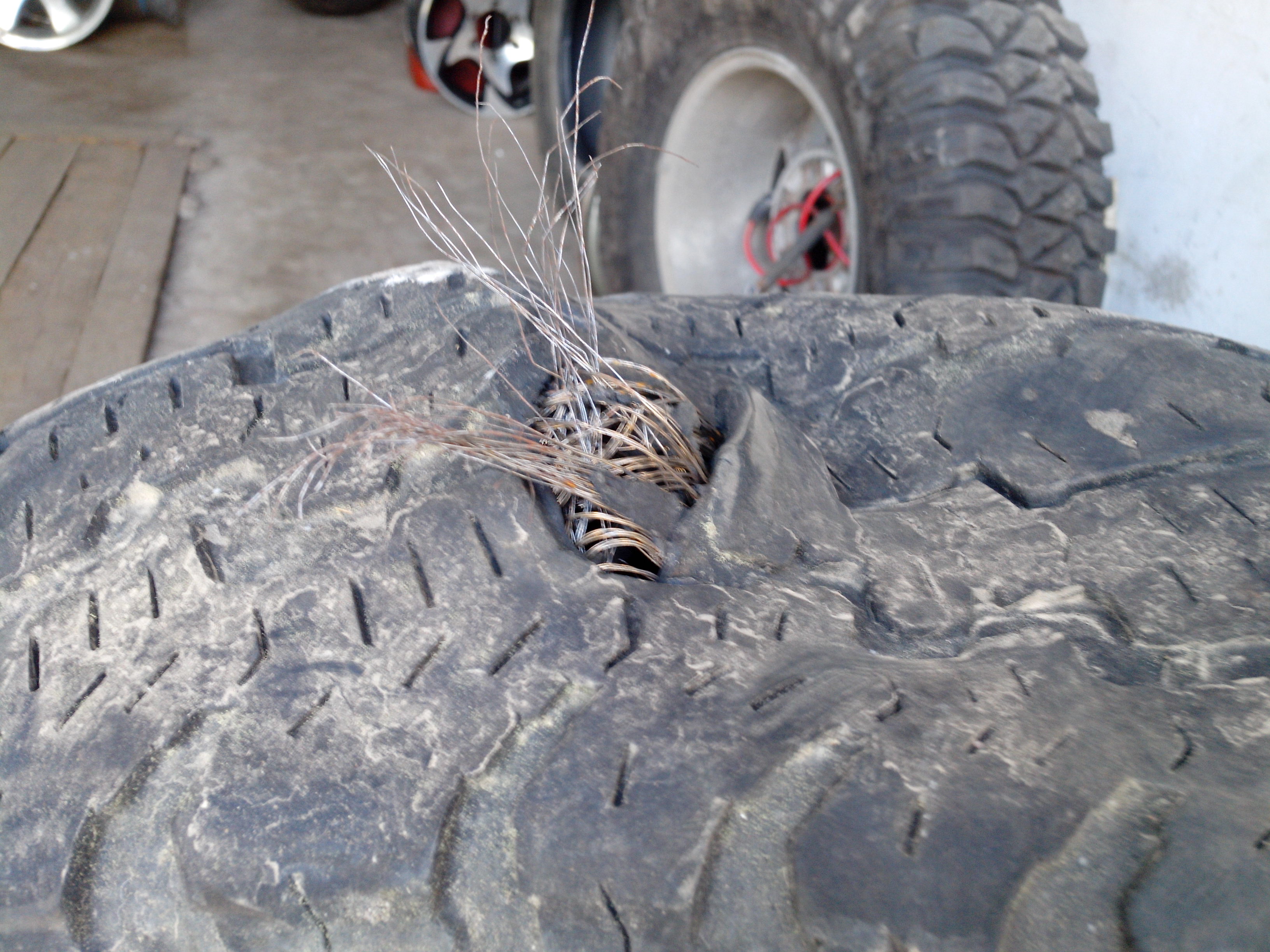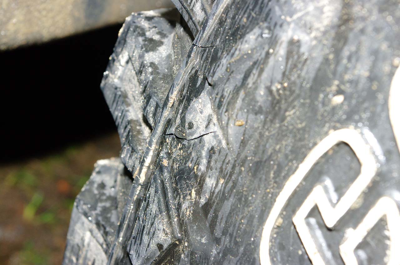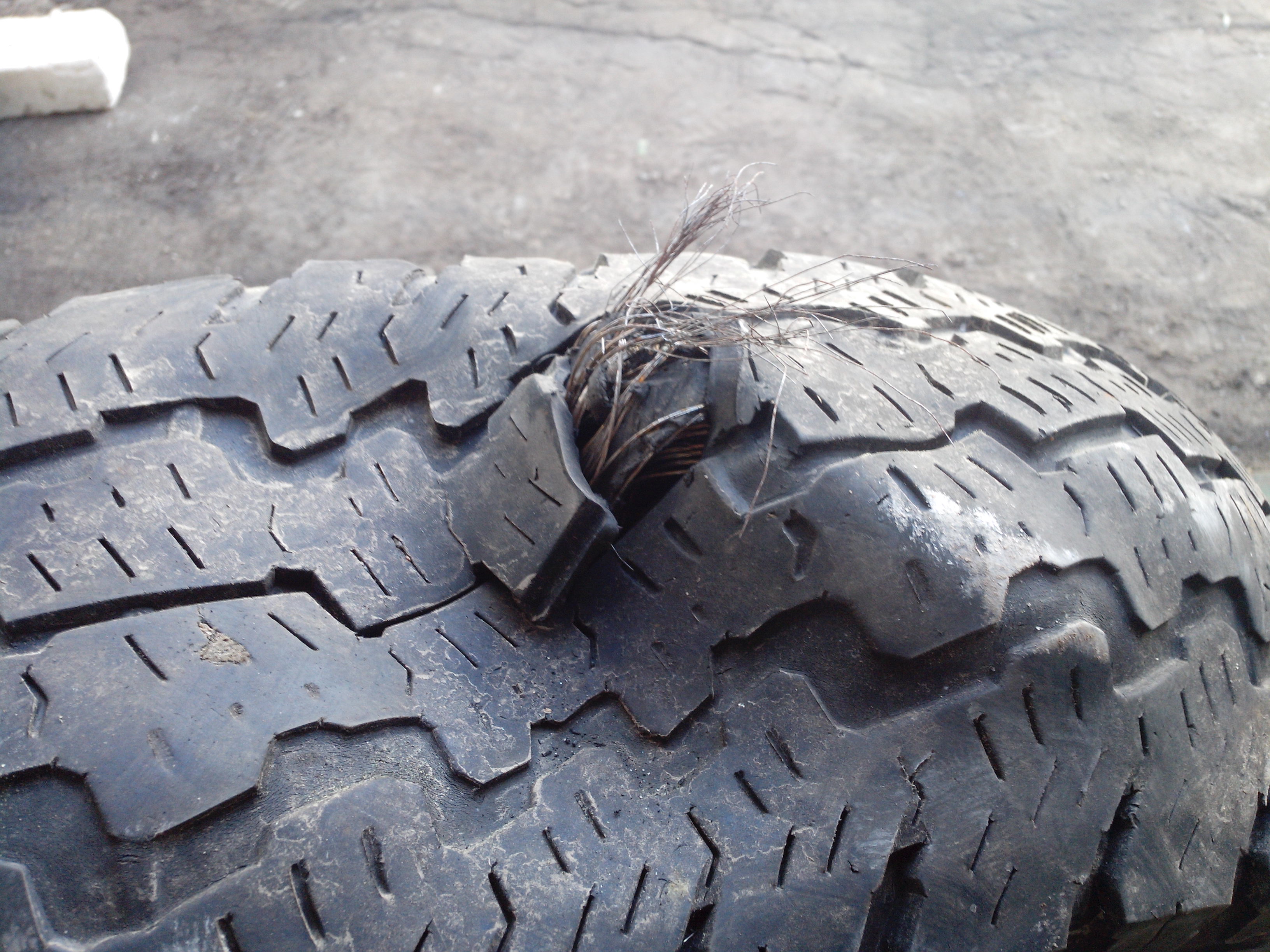 Сегодня дошли руки сфоткать то, что осталось от покрышки. На фото место разрыва, а так же лопины по протектору.