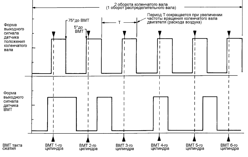 Проверил датчики коленвала и ВМТ. Земля и питание на разъеме есть, подтяжка на сигнальных выводах к +5В с ЭБУ есть. Отключил разъем, подал питание на датчик, на сигнальные выходы подключил светодиод с резистором, кручу стартер. С выхода датчика ВМТ светодиод мигает (очень тускло), с выхода датчика коленвала нет. Подключаю датчики поодиночке к разъему, без датчика коленвала машина не заводится, без датчика ВМТ заводится, горит чек, работает на холостых вроде неплохо, чуть плавают обороты, но у меня они и так плавают. Из под капота цокот не как обычно, видимо, ЭБУ брызгает форсунками сразу во все цилиндры (не знает где и когда нужно). После подключения датчиков в штатном режиме в сохраненных ошибках есть ошибка датчика ВМТ, ошибки датчика коленвала нет, возможно потому, что машина не завелась. Ясно, что сигнал с датчика коленвала есть, но корректный ли? Жаль, нет осциллографа. Не совсем понятно, какой должен быть сигнал. В книге вижу, что его частота и скважность не очень сильно отличаются от датчика ВМТ, но вот в этой теме пишут, что частота отличается очень сильно, на 2 порядка, в соответствии с прорезями.