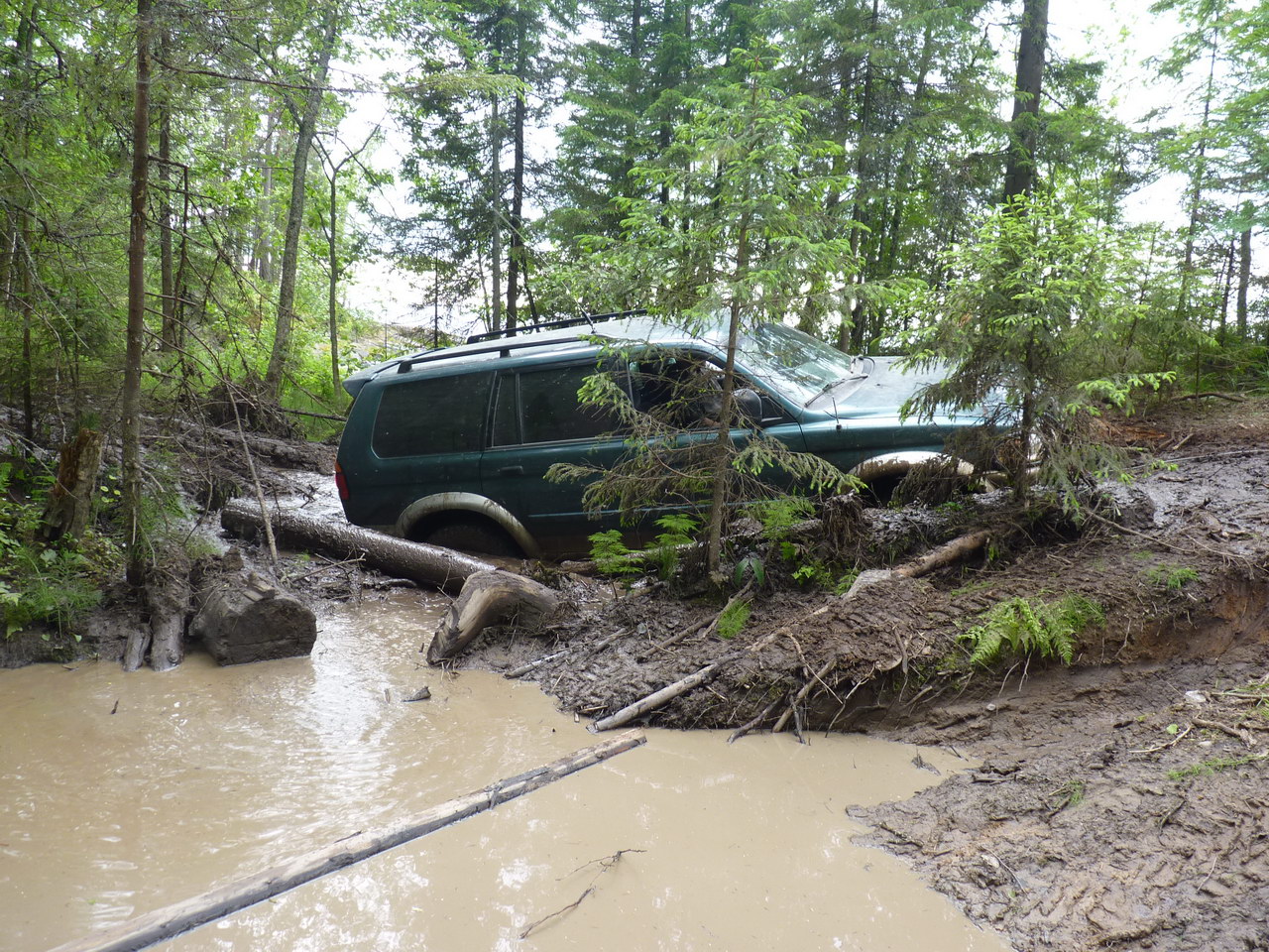 на гати попали в пробку)) Хтрайл с прицепом сидел между бревен, пришлось вынимать