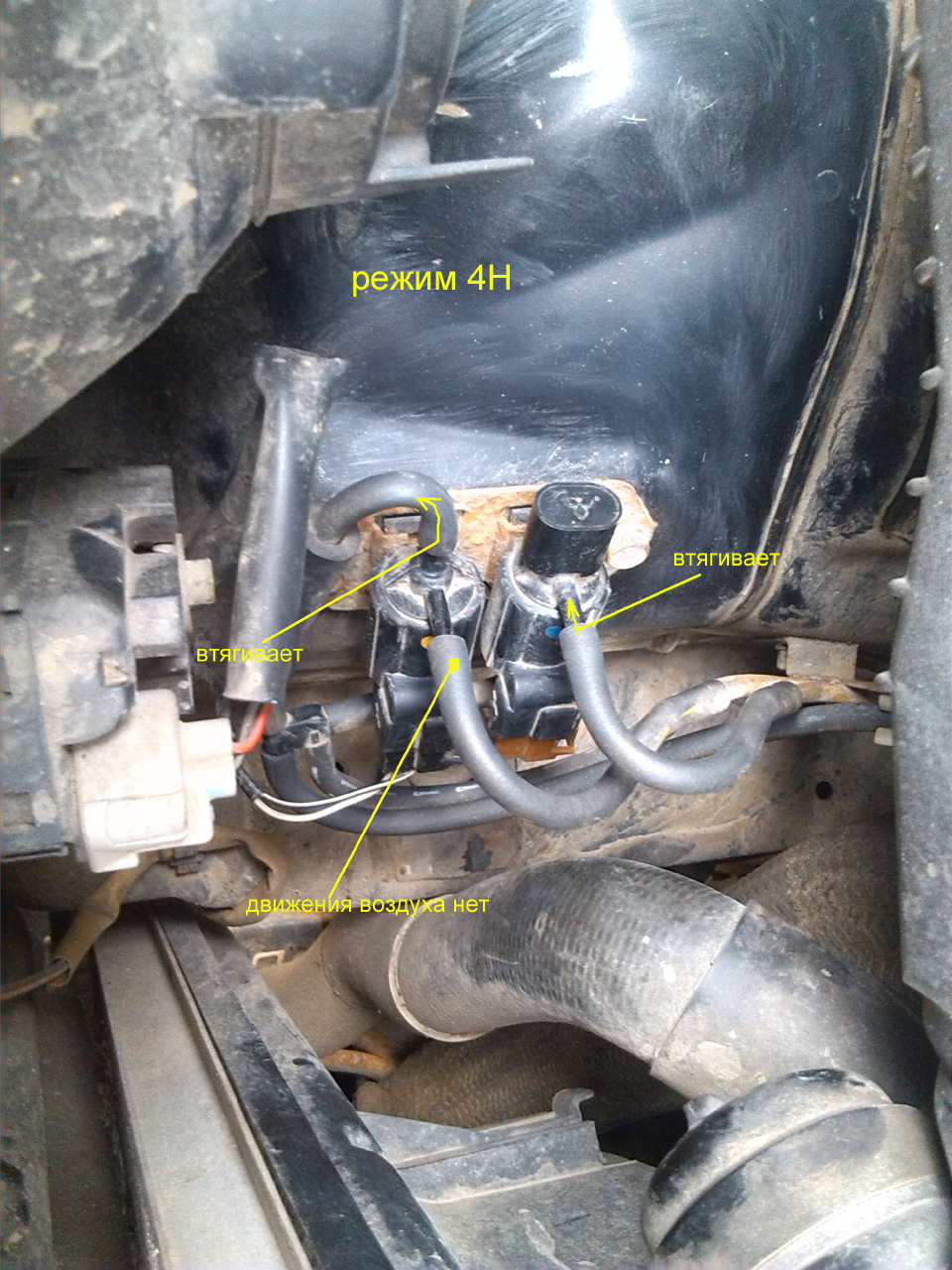Именно поэтому при одном работающем клапане, стоящем на месте клапана A (расположенному ближе к переду автомобиля), система будет работать исправно, подключая и отключая полный привод, без всяких ошибок. Ну вернее, будет работать, но несколько раз в день все таки отключать вакуум и задвигать привод на 4H.