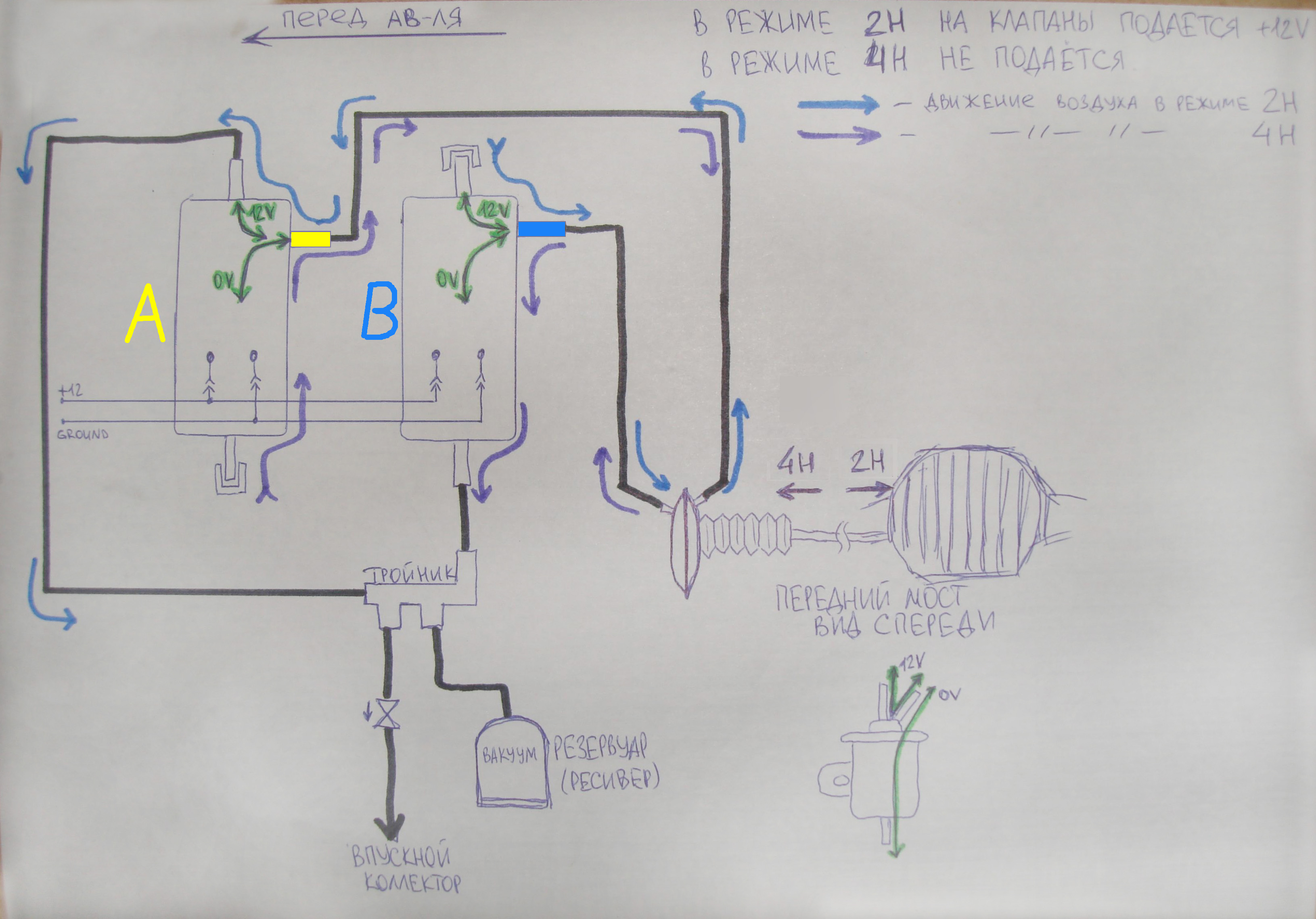 Дядь Вась, Hunter, сегодня намерил и законспектировал следующее. В трубочках резиновых дыр не обнаружил. Клапан, что расположен в трубке от блока клапанов к впускному коллектору работает, как и положено, только в одну сторону. Сопротивление между контактами желтого клапана 44 Ом, синего -62 Ом. По книжке положено в допуске от 36 до 46 Ом. Во время самопроизвольного подключения передка при езде никаких контрольных ламп раздатки не мигает. Ну и рисунки: