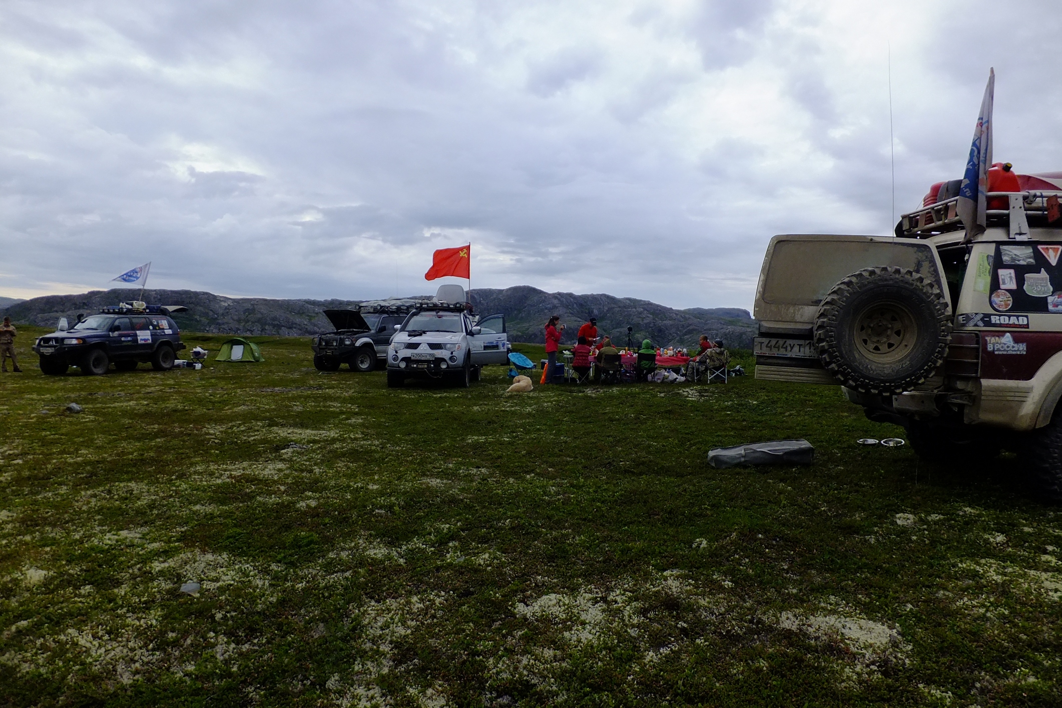 Останавливаемся у южных отрогов Тунтурей, нас уже почти накрывает облачность, дорога портится, а за насыпанном через озеро бродом, вовсе становитца похожей на горную тропу. Кто то остается тут, кто то как может, догоняет тверских, которые уже иногда теряются из вида в облаках..