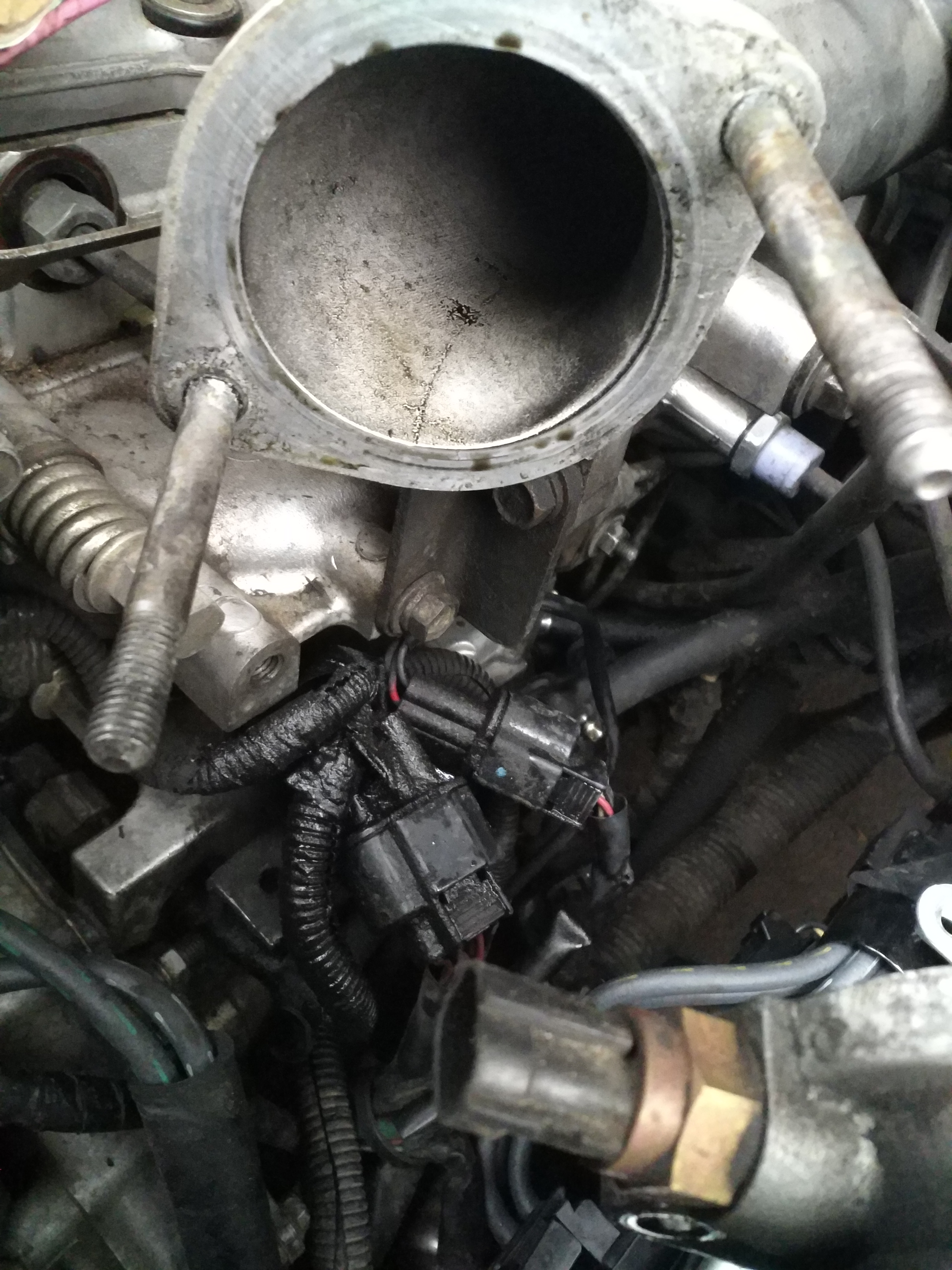 Однако при снятии дроссельной обнаружил следующее: жгут проводов и фишки, находящиеся под заслонкой в масле! Весь тнвд черный и в налёте. На фото видно, что масло вытекает из нижней дырки и походу из мембраны....