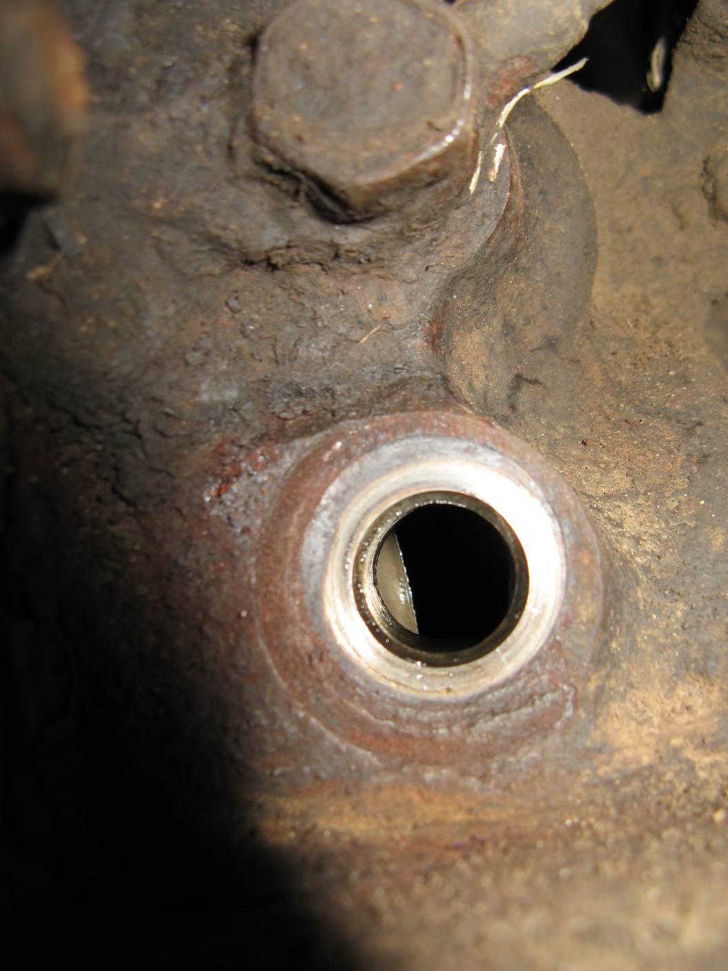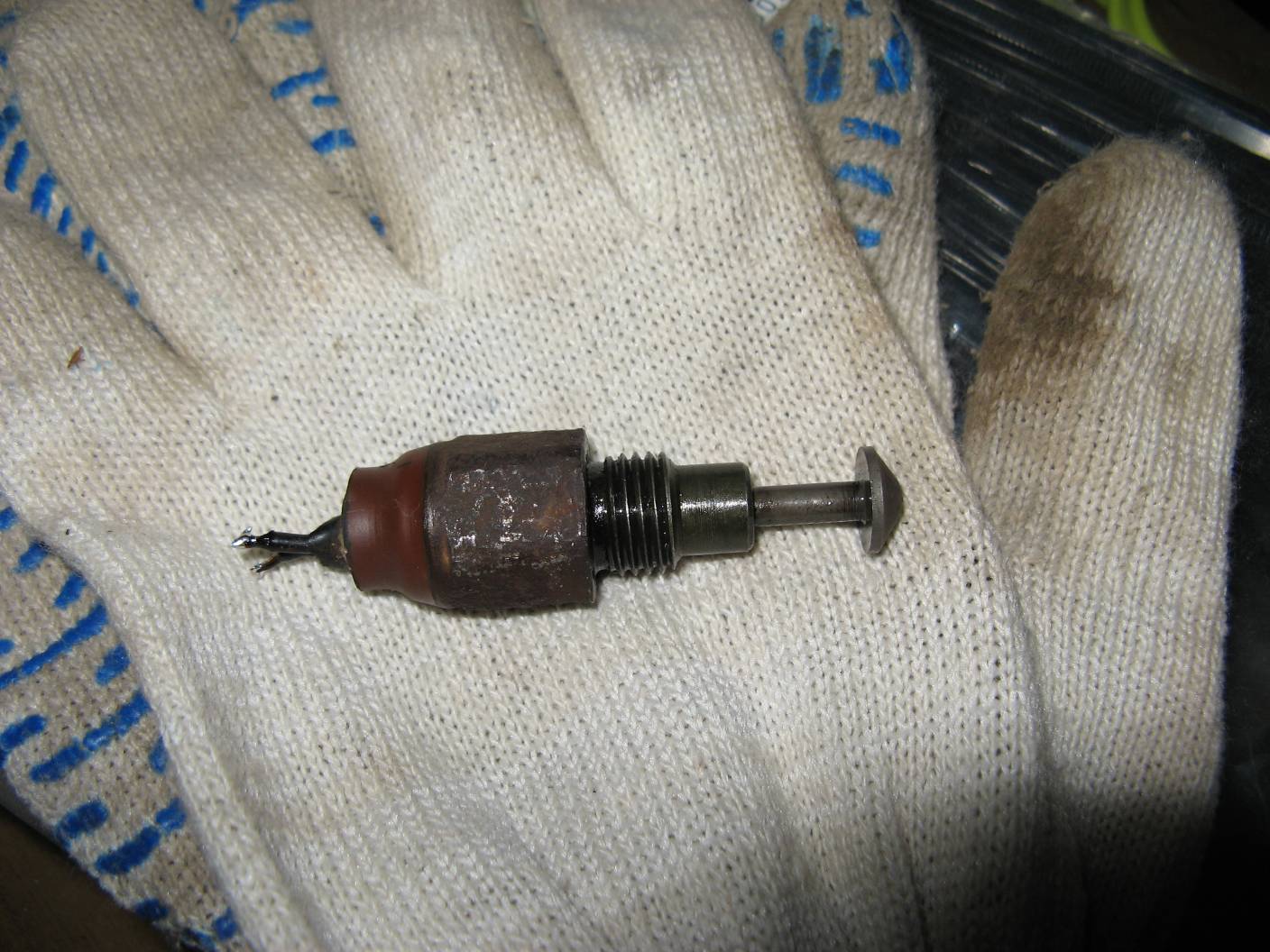 Тоже менять надо, заказал новый датчик. Старый закис, вытащив его и подергав туда-сюда, вроде разработался, но ненадежно, иногда контакт почти теряется, сопротивление колеблется до 100 Ом. От нечего делать баловался, пробовал делать вакуум своими легкими - нифига диск не выходит наружу. Когда дул туда (сильно, аж глаза вылазили), диск начинал утапливаться. Пробовал вытащить его наружу, поддев шляпкой длинного самореза, не получается. Тянул сильно. Видимо, он вытащен до упора. Спичками пока не игрался, успею еще наронять их туда с новым датчиком. Как видно из фоток, диск находится в части отверстия ближе к заду авто.