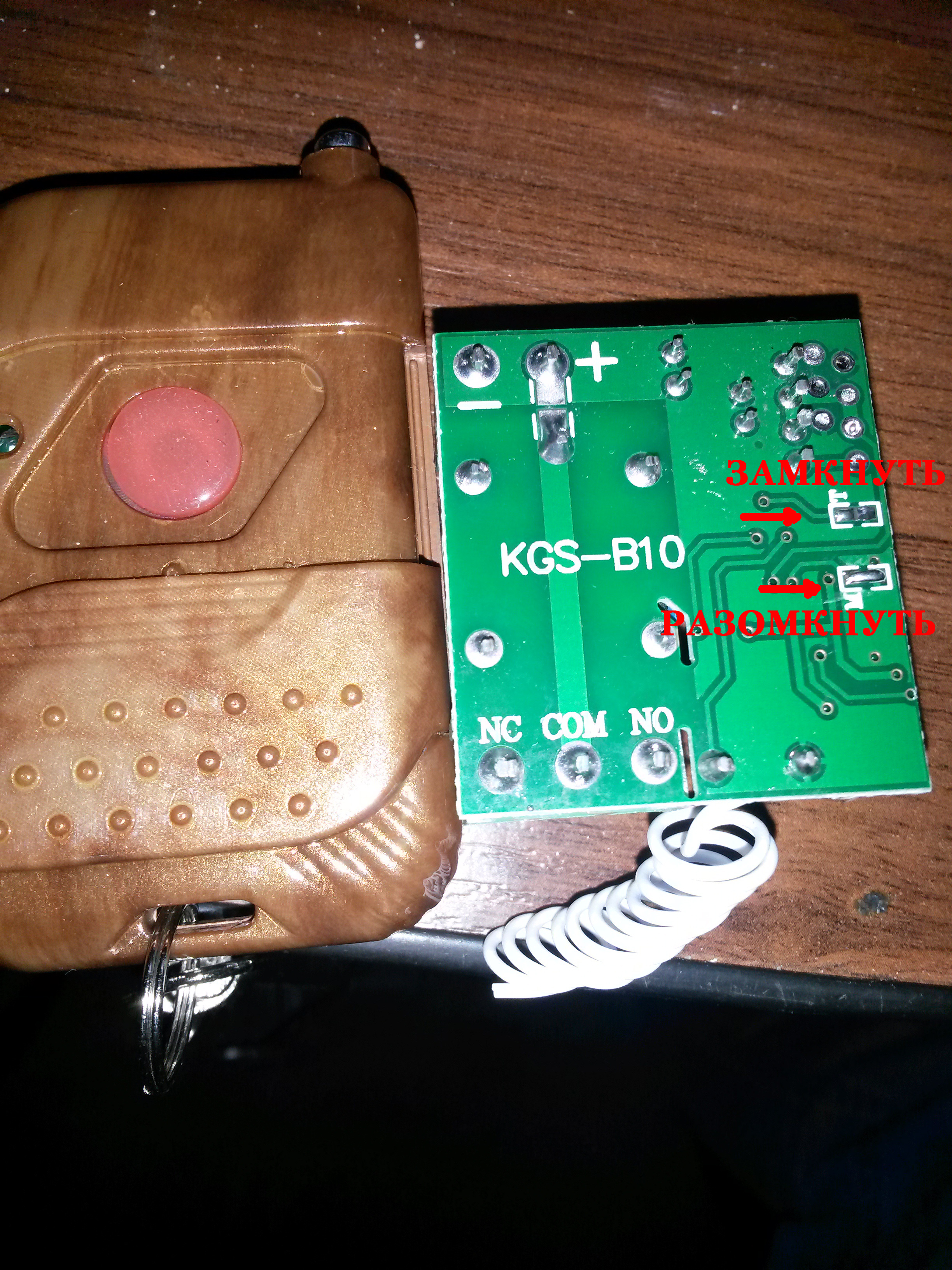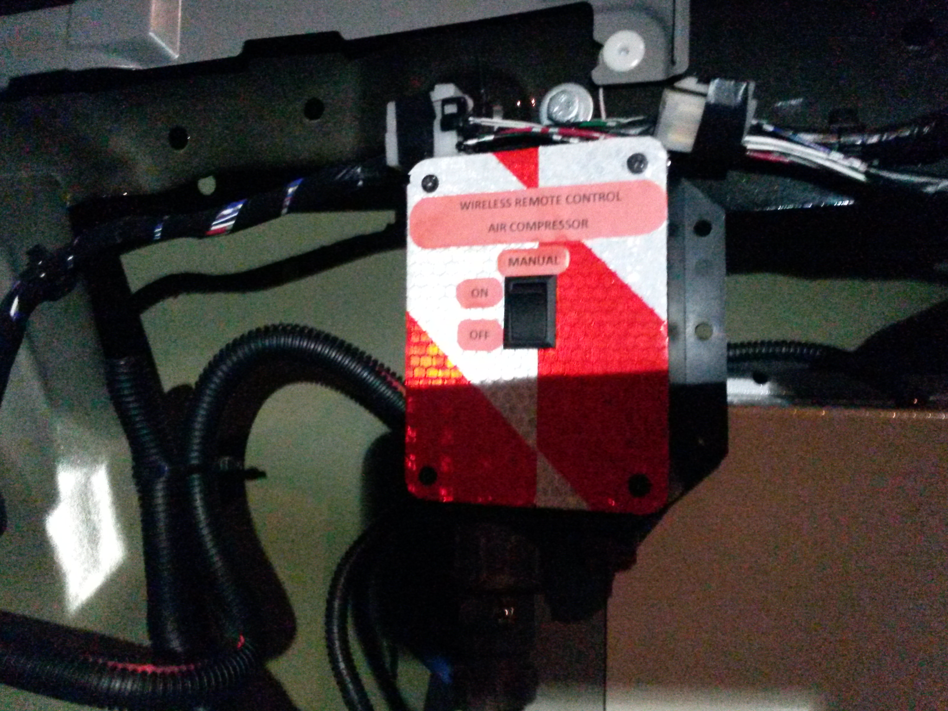 При использовании компрессора приходится много раз ходить от манометра к кнопке включения компрессора. Не понимаю, почему нельзя было сделать манометр возле компрессора.. Так вот глядя на опыт бывалых, решил я тоже сделать управление с радиобрелка. Тем более, несколько комплектов давно пылились на полке. Электрическая схема выглядит так. Питание (оба провода) от источника идут в коробочку управления через 4х контактный военный разъем, а из коробочки оба провода идут к компрессору. В коробочке стоит предохранитель (40а), реле (40а), а управляет этим реле плата радиоканала или кнопка (MANUAL) на лицевой стороне коробочки. Кнопка эта, на случай выхода из строя радиоуправления, потери брелка и т.п. А в случае выхода из строя всей коробочки, военный разъем мама из нее (через лючок) выкручивается, вставляется 2 перемычки из любой проволоки прям в разъем и дальше вкл-выкл осуществляется автоматом под капотом. Питание кстати взято с клемм инвертора. В повседневном режиме, автомат под капотом находится в выключенном состоянии. Отдельное внимание хочу уделить плате радиоканала. Плат этих на aliexpress полно. На плате есть 2 маленькие перемычки. Не всегда продавец отправляет описание. Мне по крайней мере ни одной инструкции с комплектами не присылали. Приходит плата, работающая в режиме – пока держишь кнопку брелка - реле замкнуто, отпустил – цепь разомкнута. Если перемычку перепаять (на рисунке показано) то режим будет такой – нажал кратковременно - реле замкнулось, нажал еще раз – разомкнулось. Этот режим нам и нужен. Еще по моему есть еще какой-то режим и есть микро кнопка на плате, но я не вникал. Еще хочу уделить внимание антенне. Она в моем случае была из одножильного, скрученного в пружинку, тонкого провода и место пайки было сопливым. Точнее проводок просто крутился в плате. Заменил на МГТФ длинной 35см. Ну типа пол волны от 433мгц) и растянул почти прямо из коробочки. Дальность уверенного приема со сложенной антенной брелка 10м. по диагонали от места установки. Более чем..