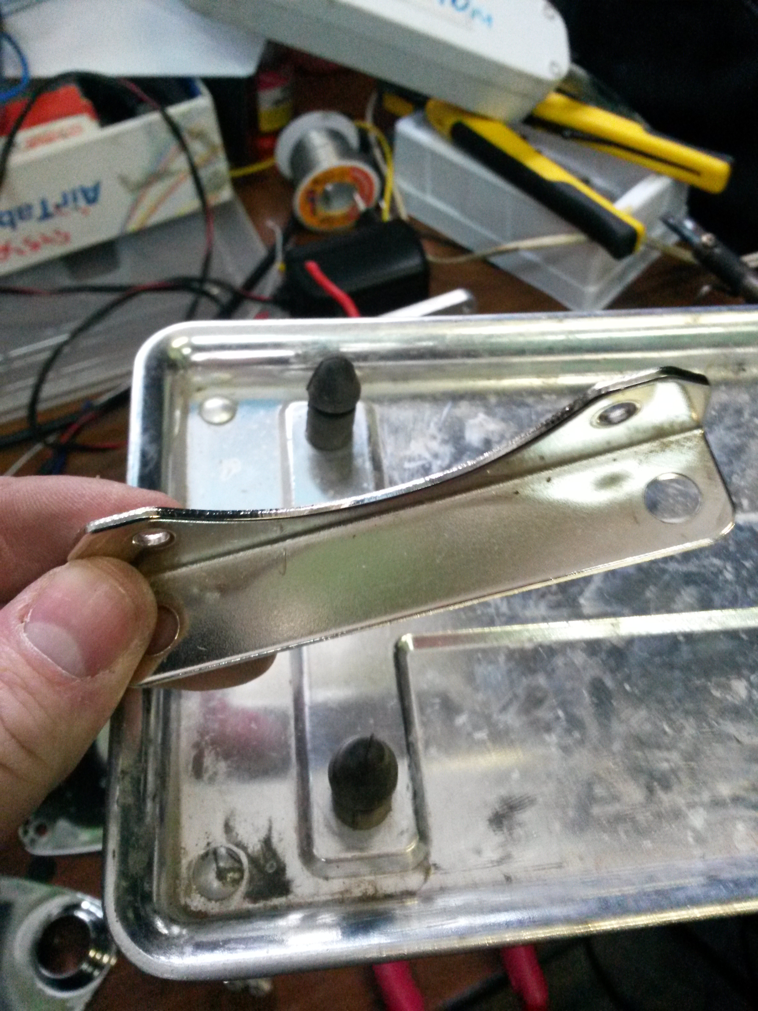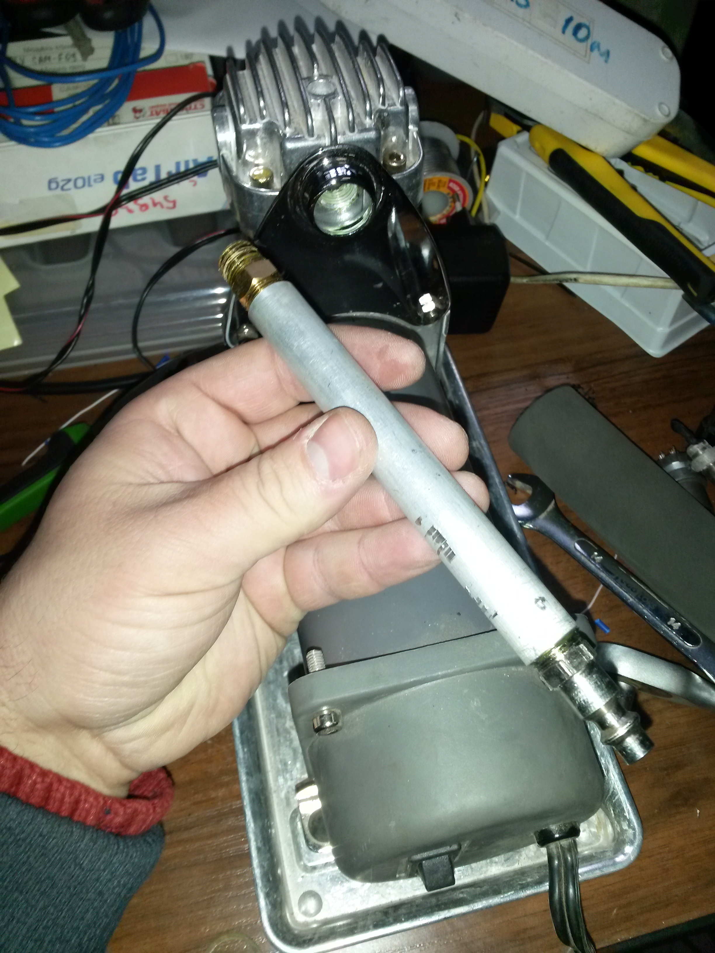 Торцевую часть компрессора, где находится кнопка включения тоже можно снять. При желании кстати, при умении аккуратно паять, реле и плату радиоканала можно уместить в этой торцевой части. Убрав кнопку включения и оставив предохранитель на кабеле.
