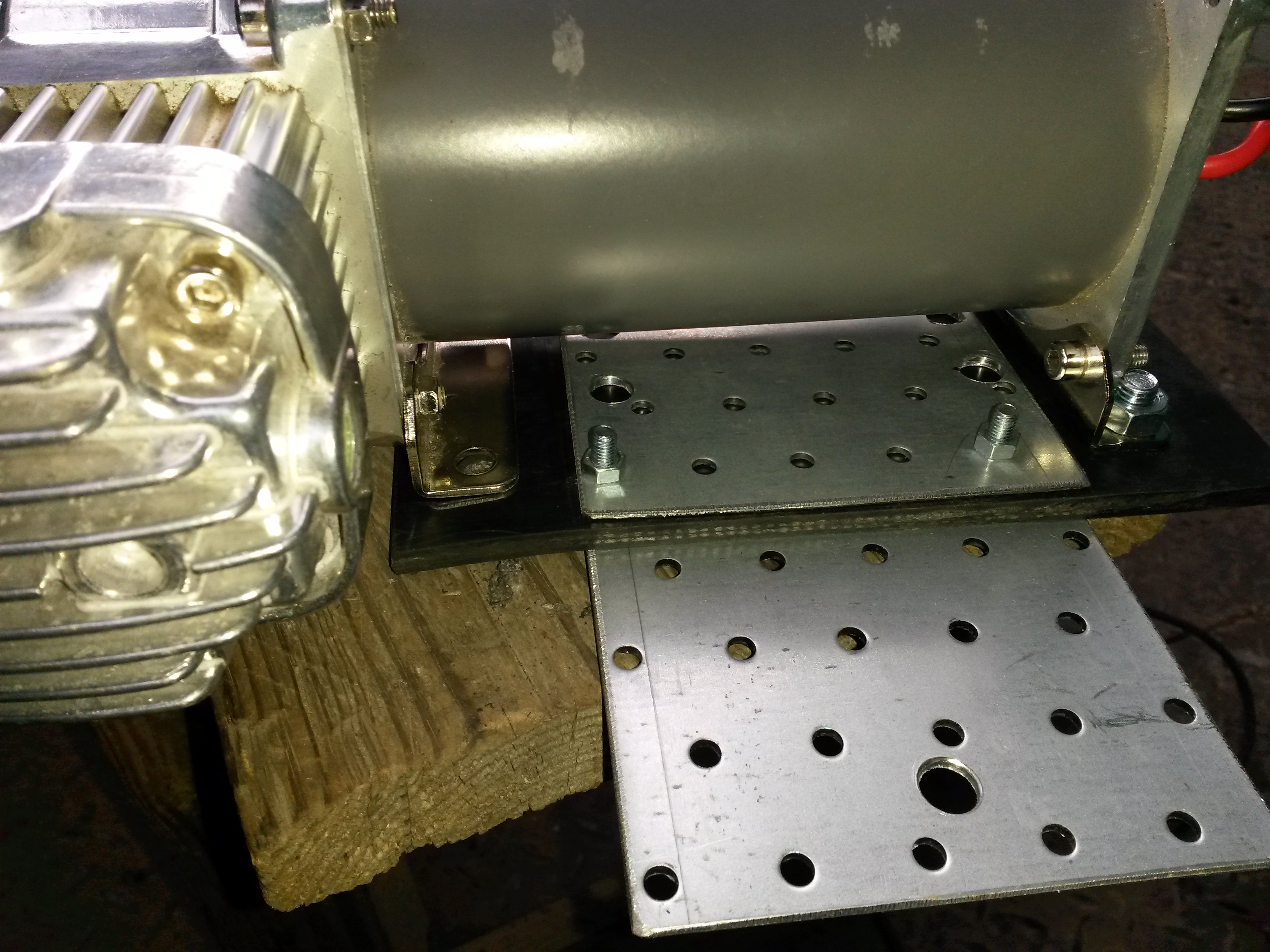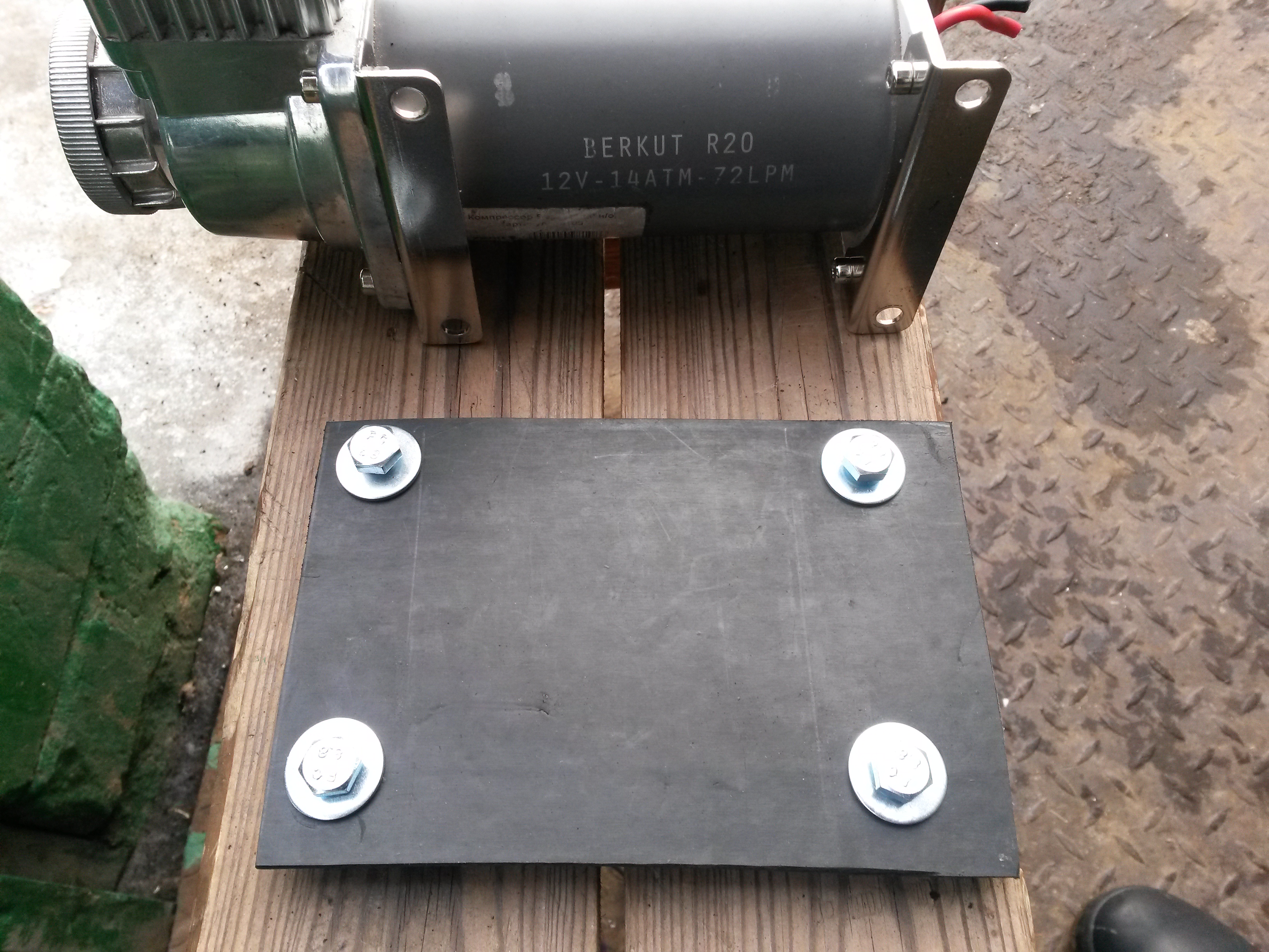 Крепление самого компрессора к кузову реализовано через транспортерную ленту оставшуюся после изготовления брызговиков. Она очень прочная и в то же время резиновая, что поможет избежать передачи вибрации на кузов. Что плохого в жестком креплении к кузову..? Хочу чтоб было не так шумно. Чтоб вырезать нужную форму из транспортерной ленты, пришлось опять достать жену болгарина). Ножом отрезать нереально. Компрессор крепится к ленте, а лента зажата между 2х монтажных пластин, одна из которых жестко крепится к кузову, вторая роль большой шайбы. Весь это бутерброд получился довольно жестким, в то же время вибрацию гасит очень хорошо. Пластины обмотал черным матовым скотчем. Для красоты)