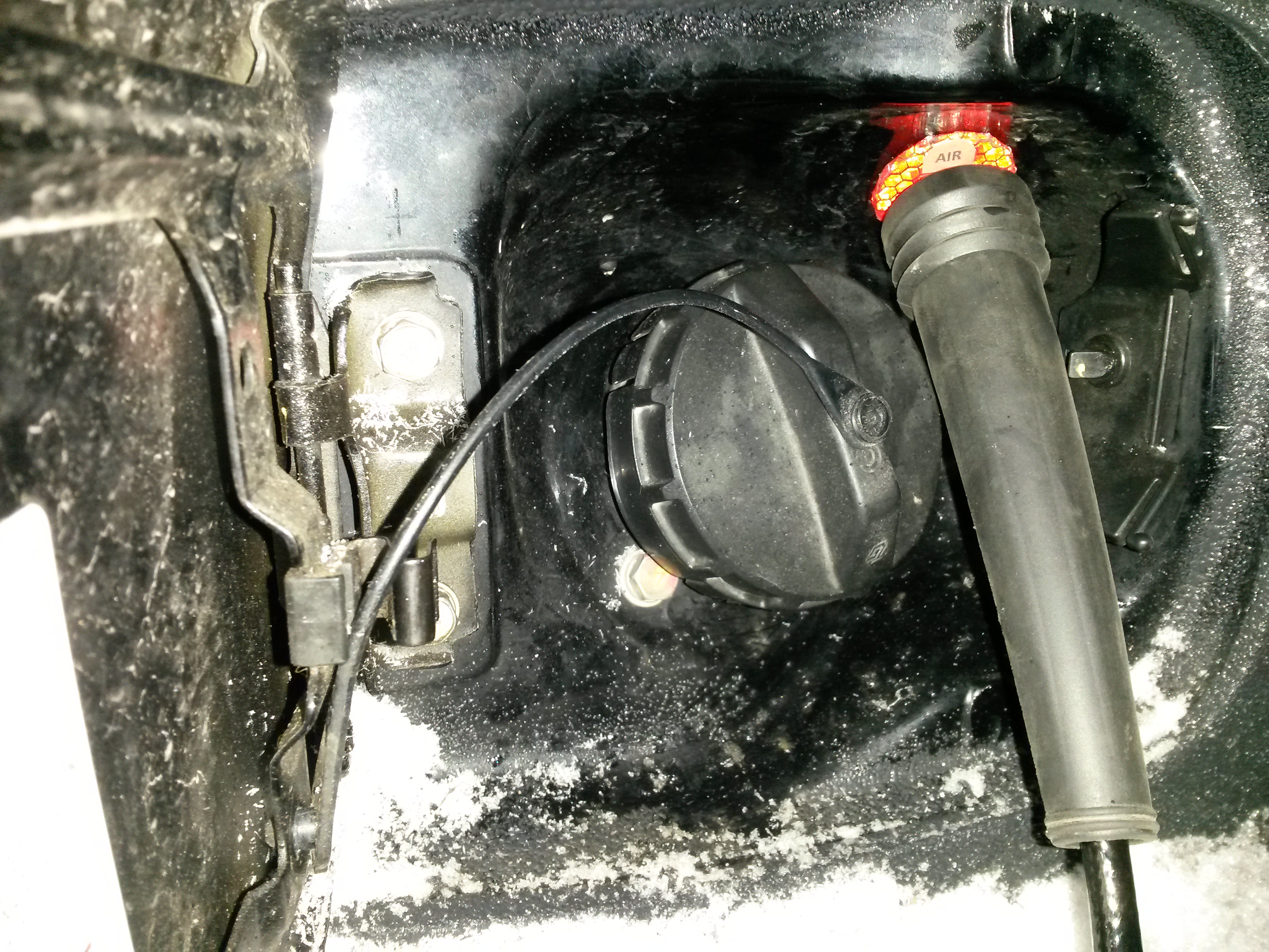 Сначала «раздеваем» компрессор. Снимаем платформу с резиновыми ножками откручиваем треугольные держатели ручки, сама ручка снимается, внутри нее алюминиевая трубка, с одной стороны быстросъем-папа. НЕСТАНДАРТНЫЙ! Обычные мамы к нему не подходят. Видимо политика БеркутА. С другой стороны этой трубки переходник ввернутый в компрессор. Трубка эта нам не понадобится со всем, что в нее ввернуто. В компрессор вворачиваем штуцер под шланг 6мм. Шланг тефолновый, рассчитан на приличное давление и температуру выше 200 градусов. Купил 3 метра. Хватило впритык. Даже не осталось кусочка. Выходит он в лючок бензобака по классике. С обеих сторон лючка шайбы, на наружную наклеил как и на коробочку, светоотражающую ленту и надпись «AIR» Быстросъем папа т.к на родном шланге мама. И резиновый колпачок, который был на компрессоре, тоже, также на папу в лючек. Кстати быстросъемная мама на шланге тоже не стандартная и не держится на стандартных папах. Тоже требуется заменить. Резьба стандартная. Резиновое продолжение быстросъемной мамы решил оставить тоже из эстетических соображений. Она плопно держится на новой маме) Проложен шланг через потолок в салоне, кратчайшим путем, одет в гофру. Зачем одет в гофру…? Ну во первых видеть, где шланг может быть прижат, лишня защита да и нравится мне, когда все в гофре)