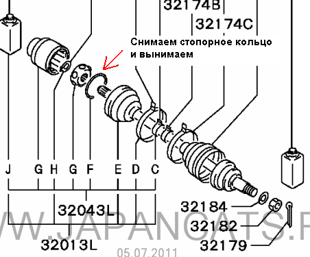 проще открутить 2 большие гайки ступичные и выдернуть весь приводной вал целиком отводя кулак вниз.