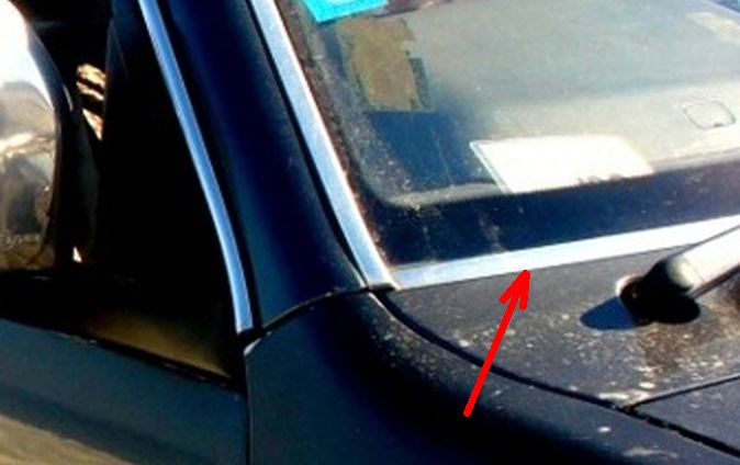 Я бы сфоткал, но машина пока еще без лобового стекла. В инете все картинки какие-то мелкие, еле нашел хоть что-то. Стрелкой указал стык нижнего молдинга лобового стекла и металлической панели под дворниками. Есть там щель? Или молдинг вплотную прилегает к панели?Zloi zhuk писал(а):Слабо понятно. Фото есть? Или картинка?