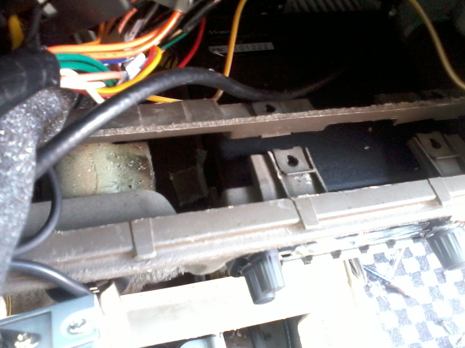 , саму магнитолу вместе с ящичком, вынимаем пепельницу, выкручиваем 3 винта, держащих направляющюю, отгибаем заднюю рамку, за что пепельничка держалась, и примериваем рацию, и определяем места крепежа, пропила окошка для тангетки.