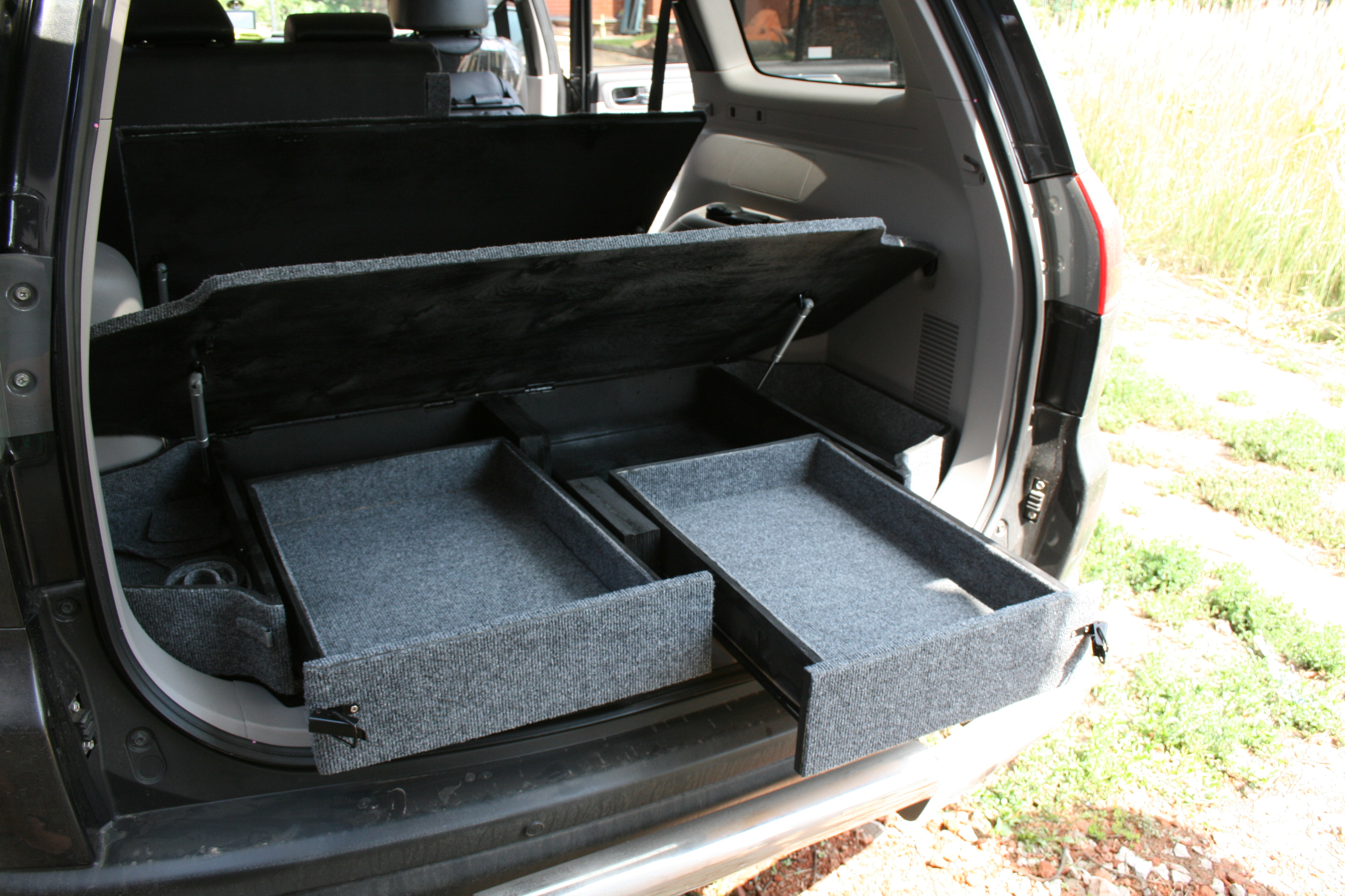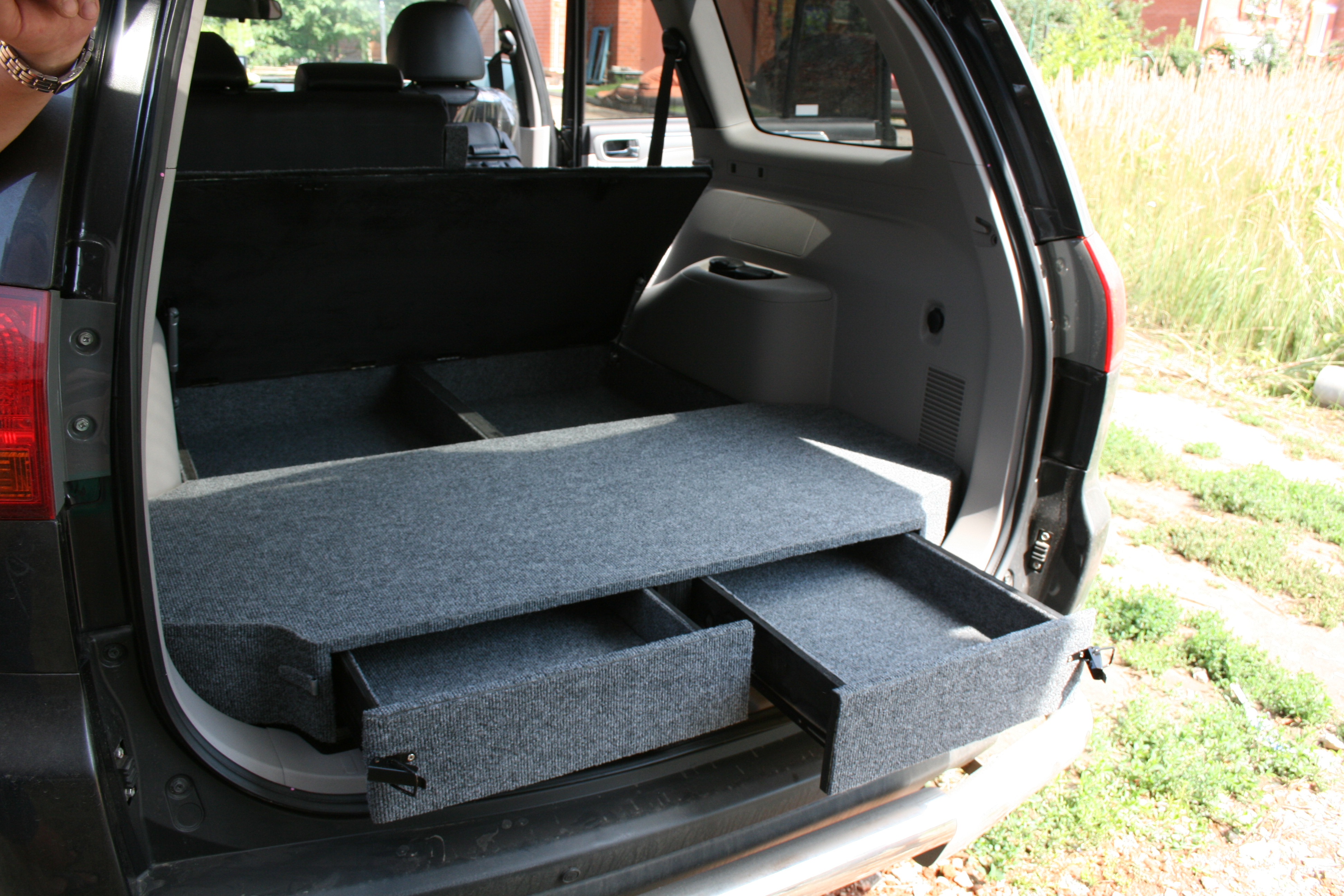 вставной 1-ый этаж в багажник - зачетно. но я бы не делал ящики. они ограничивают габариты шмурдяка, например, лопату с недлиной ручкой. а сделал бы только компактные вертикальные опоры, чтобы не прогибалась крыша (1 этажа) и делать проще, и большая свобода размещения разногабаритных вещей. правда наличие ящиков выдвижных помогает вынуть вещи в случае, когда поверх 1 этажа еще что ни будь навалено и крышку -потолок открыть невозможно. но и все равно: в глубину 1 этажа в таком случае добраться затруднительно. буду делать 1 этаж без ящиков: вертикальное ограждение по периметру, несколько компактных опор и крыша (может быть даже из двух деталей открывающихся в бок- надо еще подумать)