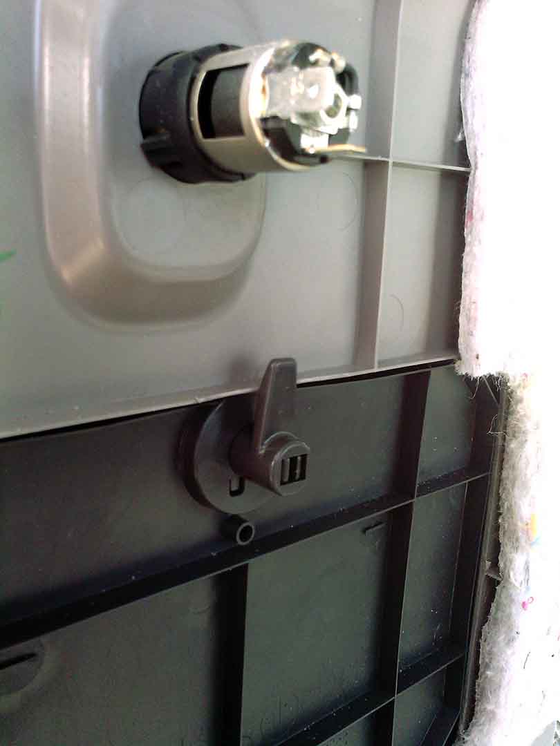 В обшивку врезал пластиковый сантехнический лючок (примерно 30 на 30 сантиметров - в будущем поменяю на металлический) и розетку леграндовскую с крышкой. Все это дело покрасили примерно в цвет обшивки.
