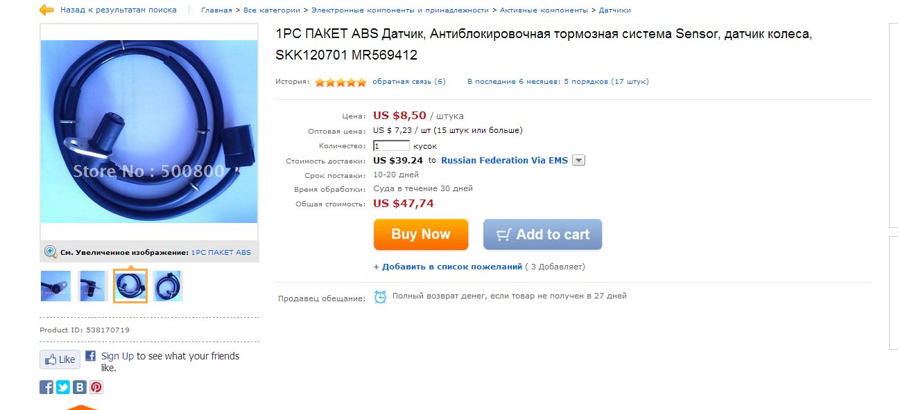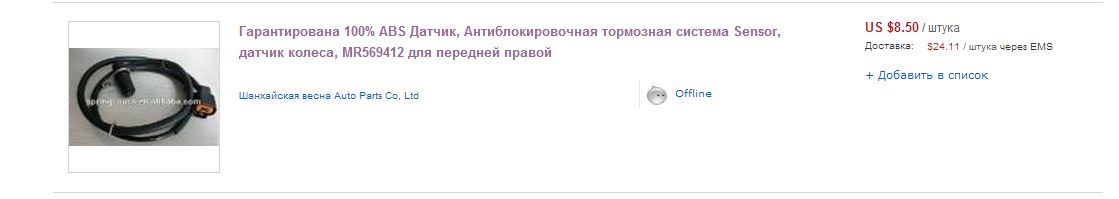 Теперь уже точно не помню, но когда прикрутил ухо датчика к цапфе - получилось что прямоугольный "носик" датчика стоит с перекосом относительно гребенки(может датчик не тот, или тот но не подошел на левое колесо), начал исправлять\поправлять, после двух неудачных попыток (лампочка АБС горела постоянно) забил. Взял на ибэе выиграв аукцион, с доставкой получилось 57$.Morgan24 писал(а):Если мой новый датчик стоил 1800 рублей, я бы заказал оригинал. Но он стоит 6 тысяч. Откуда такие цены 1800????