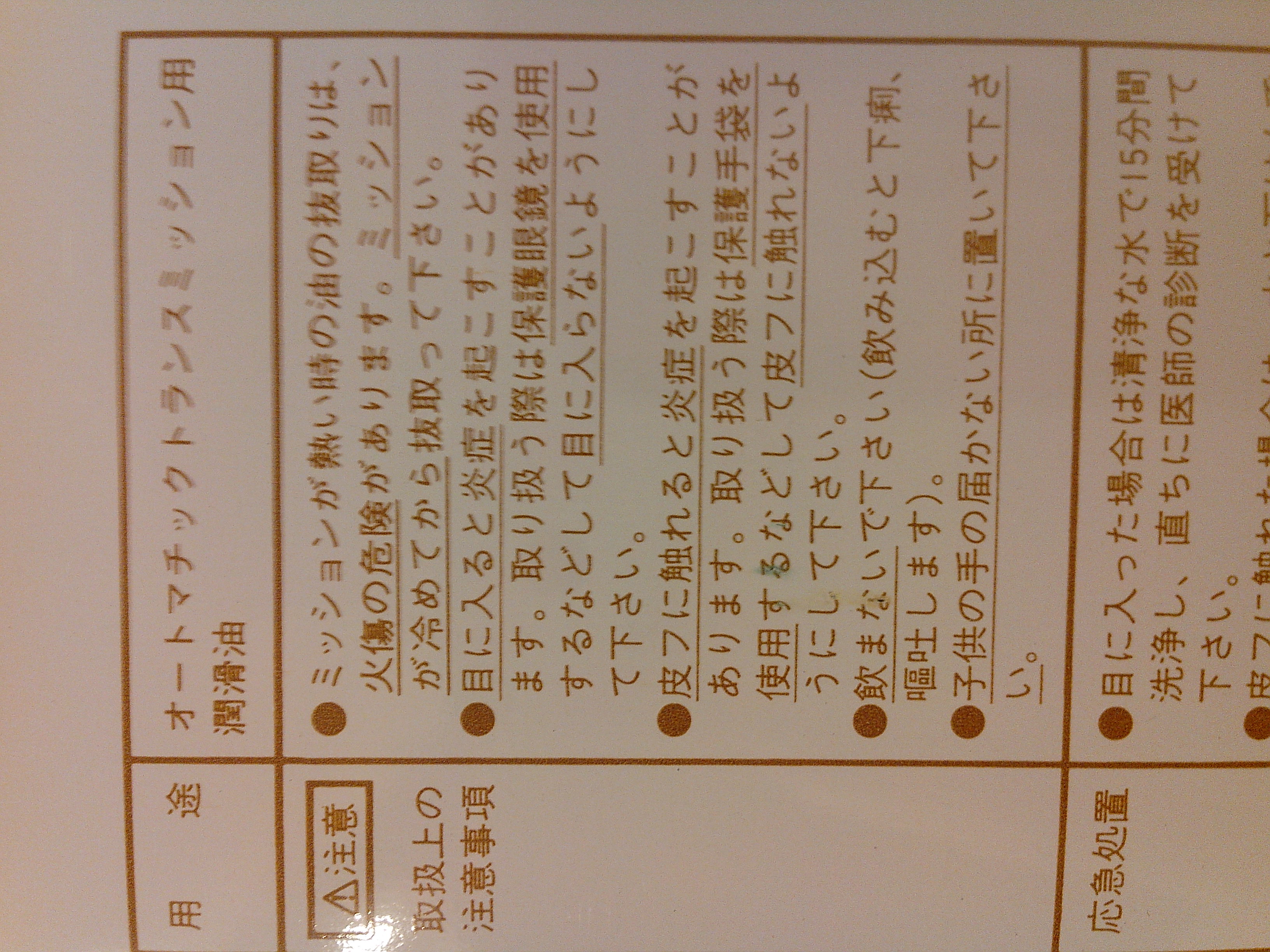 Используйте 1 автоматический i- фурму масла, когда смазочное масло для миссии ра 1 ● миссии горячая экстракция существует опасность обработки ожогов миссии 1 акул из отозванных Пожалуйста Notes |! ● При входе в глаз это может вызвать воспаление. Это может вызвать воспаление при воздействии, например, чтобы убедиться, что не входит в глазах ● кожицу использовать защитные очки при работе. Не пить ●, чтобы предотвратить его от контакта с кожей прочь, например, путем использования защитных перчаток при работе (глотать и понос, и рвота), первая помощь, пожалуйста, потушить в недоступном для детей ● ● в случае контакта с глазами, пожалуйста, обратитесь к врачу немедленно отмывали в течение 15 минут с чистой водой * есть