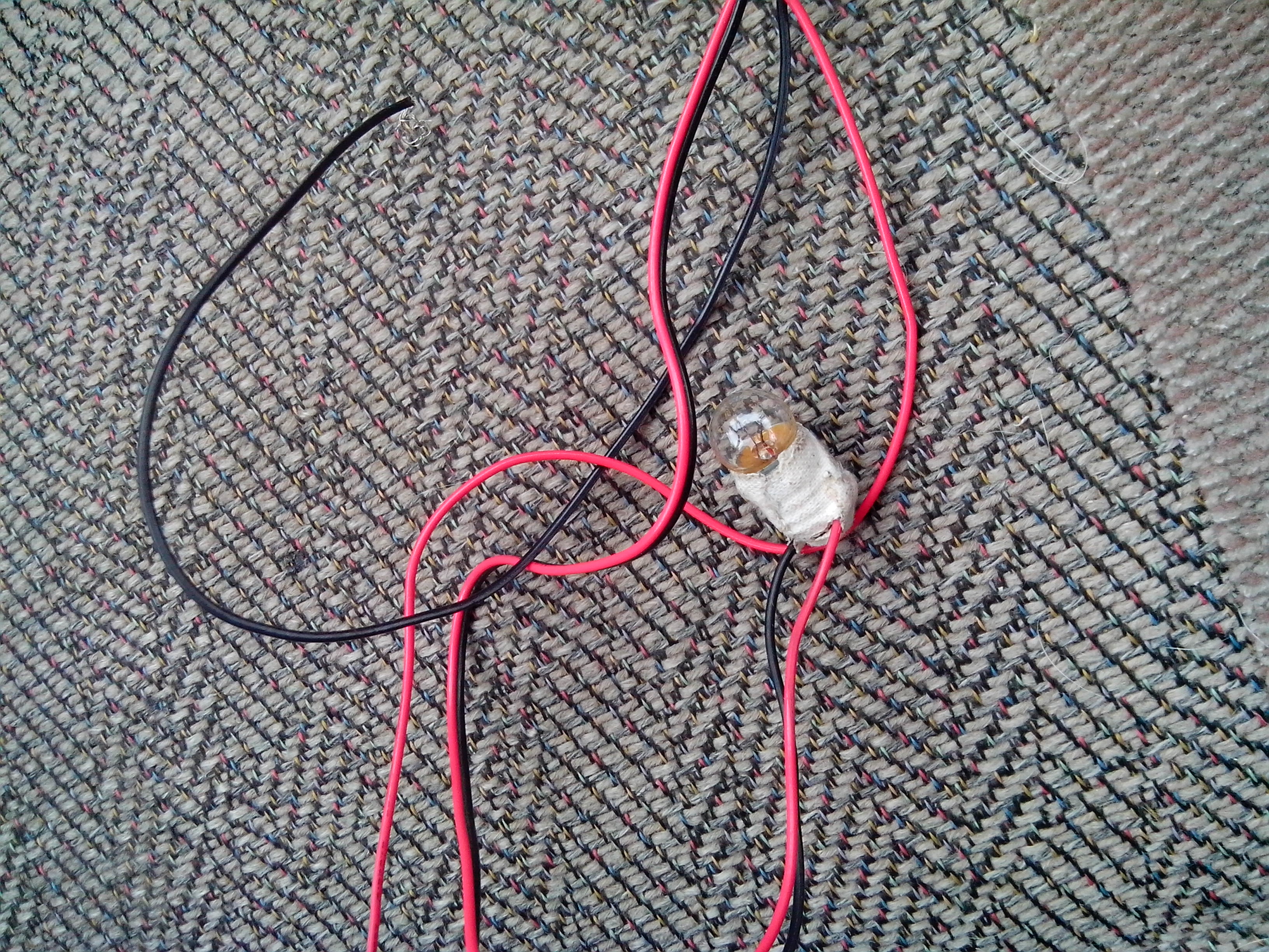 короче с лампочкой от старого фонарика, кажется на 3,5 вольта, с короткими тонкими проводками эффект тот же
