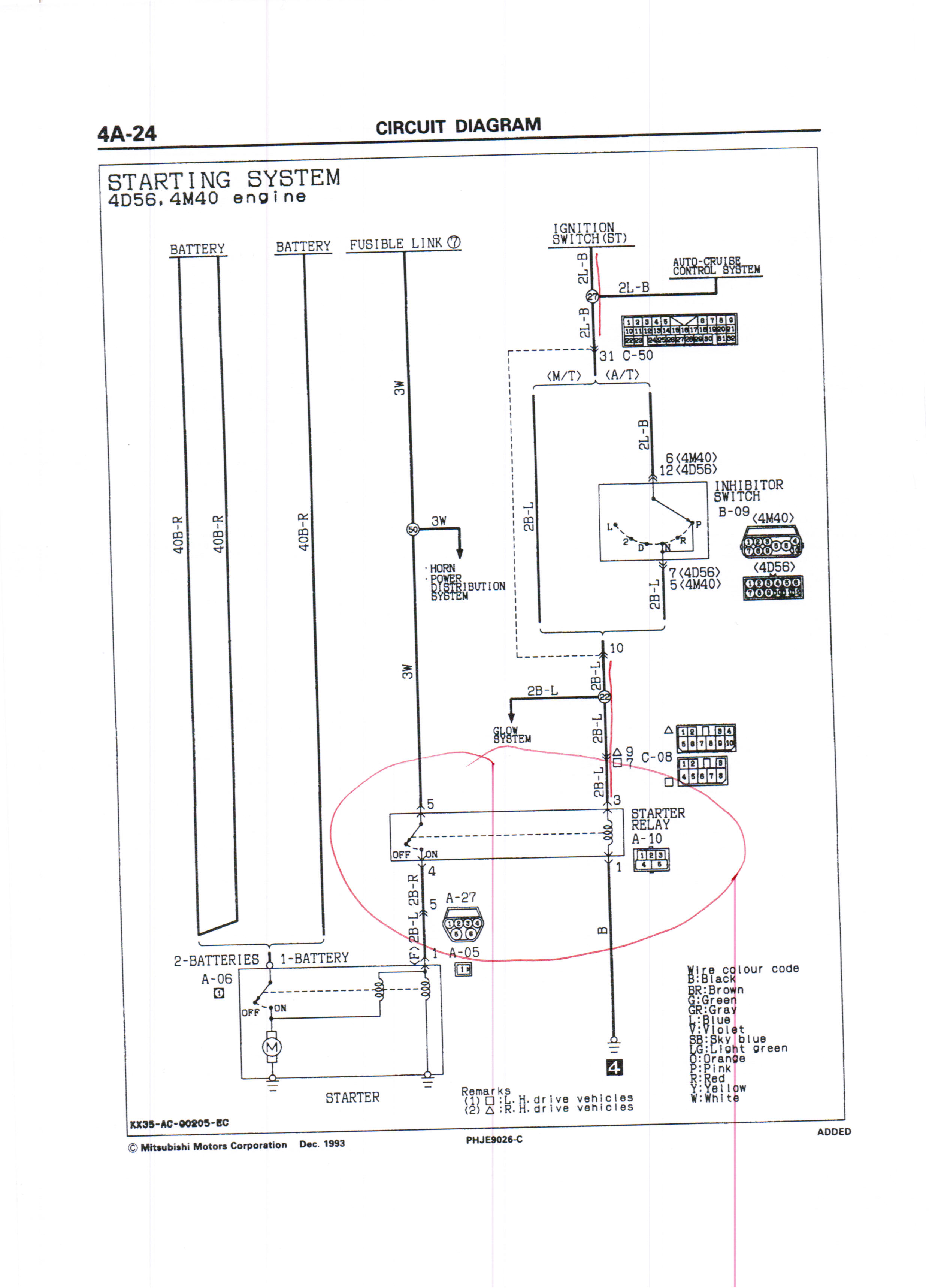 Ничего не напутал? Судя по схеме, с з.з. должен уходить сине-черный, а на реле приходить черно-синий, а черно-красный это с реле на стартер. Коробка случаем не автомат? Тогда вся эта цепь идет еще и через ингибитор, там тоже бяка может быть. Попробуй пошевелить рычагом АКПП туда-сюда и пощелкать ключом в положениях "P" и "N" мож сработает.Tatarin s sakhalina писал(а):всем привет!!!!!! ну чо......фишка вот какая.........короче на з.з приходят все плюсы в разных положениях ключа, в положении ключ на старт ток тоже убегает но не прибегает на реле. Вопрос нет ли "посредников" между з.з и релюхой ? вопрос создался на основании того что от з.з отходит провод(который на втягивающее- контролька горит только в положении ключ на старт) чёрный с жёлтой полосой а на реле приходит чёрный с красной полосойвыходит если между этой парой нет посредников то в систему уже лазили........и как мне теперь найти нужный мне провод