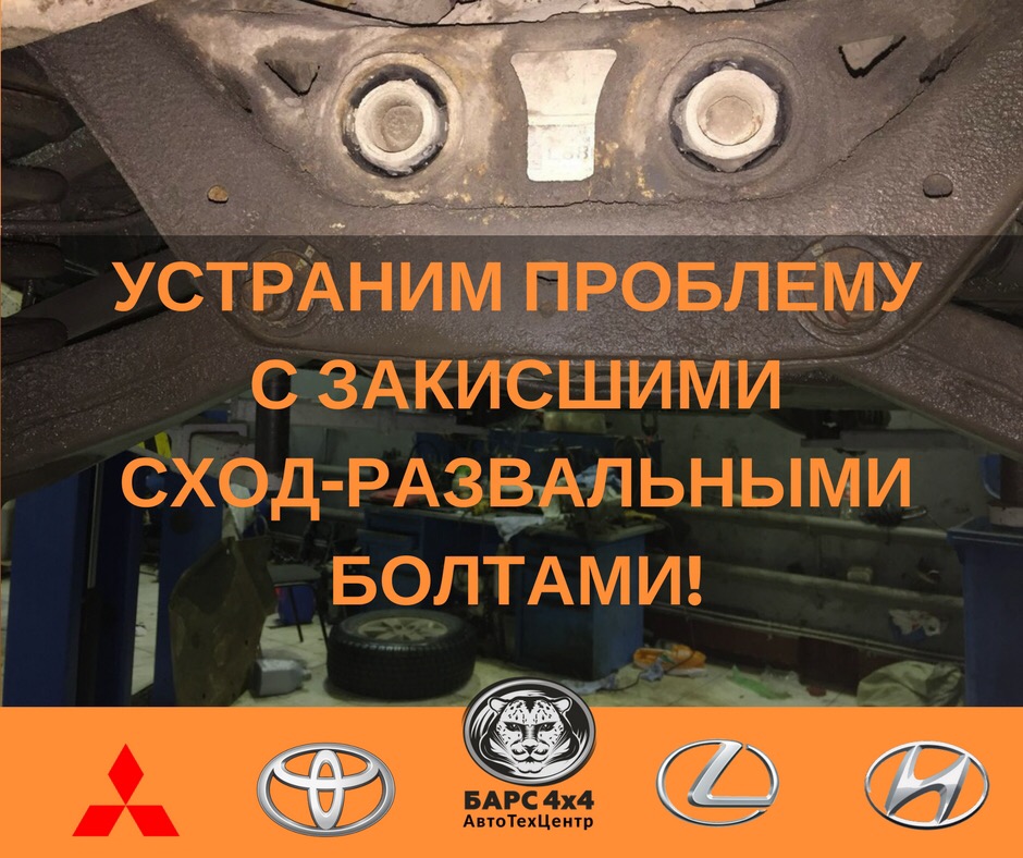 Одной из неприятных конструкционных особенностей многих японских внедорожников (особенно Mitsubishi Pajero 3,4, Toyota Land Cruiser Prado) является проблема с закисшими cход-развальными болтами (регулировочные болты закисают в сайлентблоке).