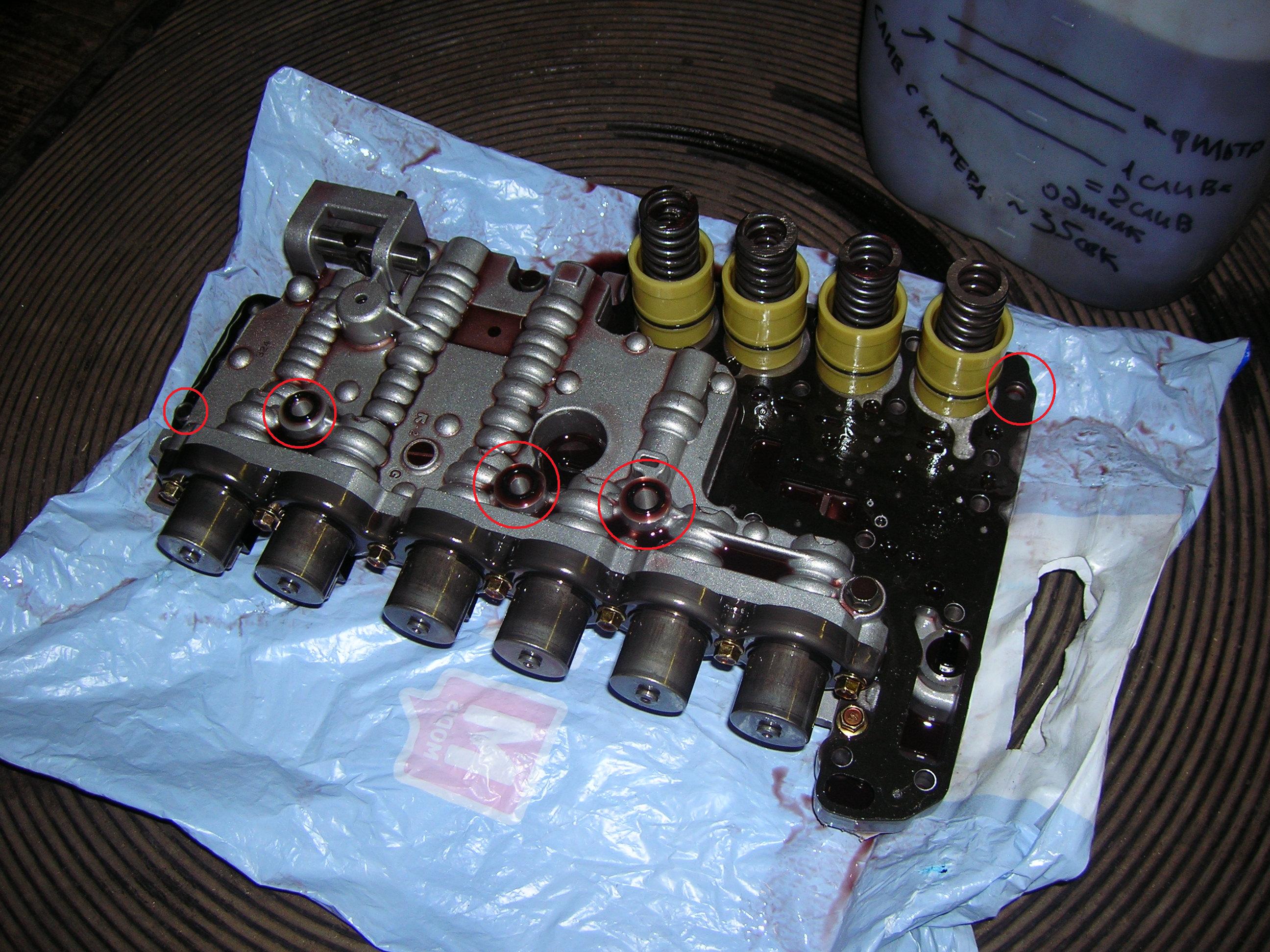 Дальше самое интересное... Нигде ведь не написано, что поршни там прекрасно держут давление! После откручивания последнего винта плата хорошо оталкивается сверху поршнями и пружинами. В итоге снять ее "как по инструкции" аккуратненько ровненько, чтобы поршни и пружинки остались "как на подносе" не получилось... поршни повалились и рассыпались кто куда... вместе с пружинами. Кто упал в тазик, кто просто раскатился по яме... в довесок еще и вывалился штифт штока селектора, который должен бы сидеть поплотнее...