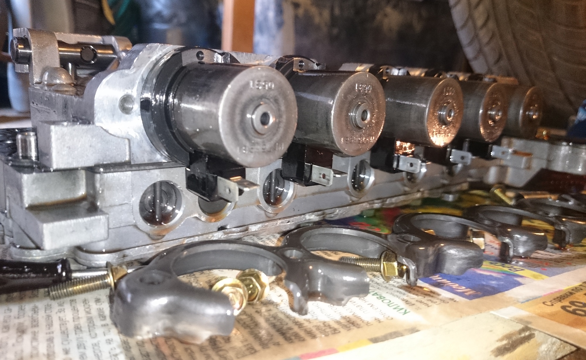 Соленоиды крайние по совету Саши тоже местами поменял. Единственное не совсем аккуратно прикрутил планку, которой они прижимаются. Средние болты нифига не угадаешь с какой силой тянуть. Они от руки самый коротеньким вороточком 7см длиной кривят эту планку наура, и болтики крутятся и крутятся... ((( Потом уже сообразил, что какая-то фигня, а планка покривела