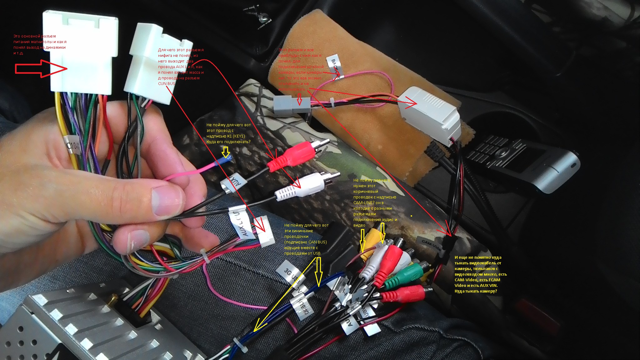 Коричневый провод - это управляющий камеры ЗХ (если не штатная). Сам видеосигнал с камеры это жёлтый тюльпан. Подключить можно и в Camvideo, и AUX, и наверное Fcam (но скорее фронтальная камера), надо смотреть по магнитоле, ее распиновку и как она управляет видеовходом. Кстати еще возможен выход на вторую зону. Отальные тюльпаны - это аудио выходы на внешний усилитель и провода для управления им.