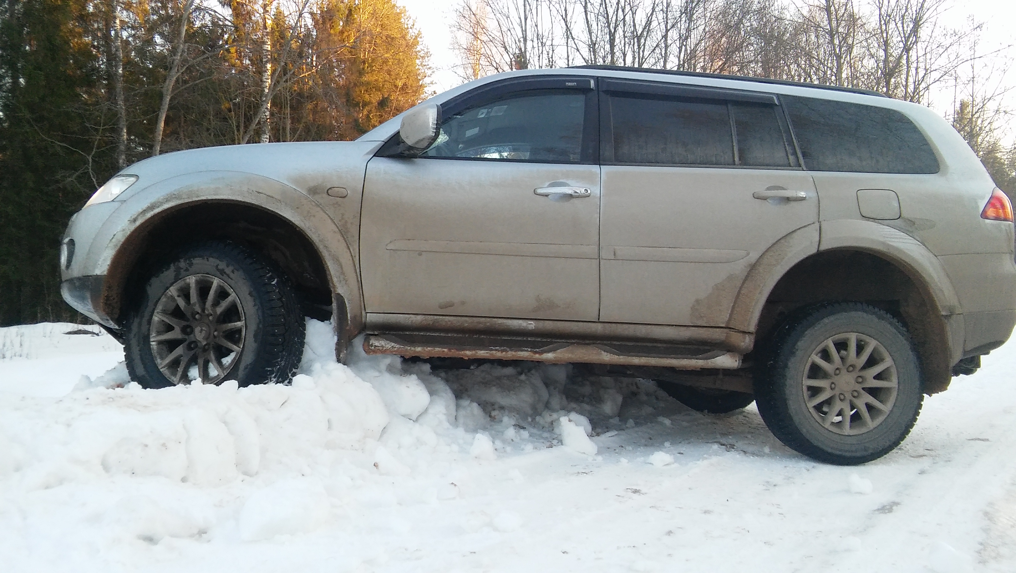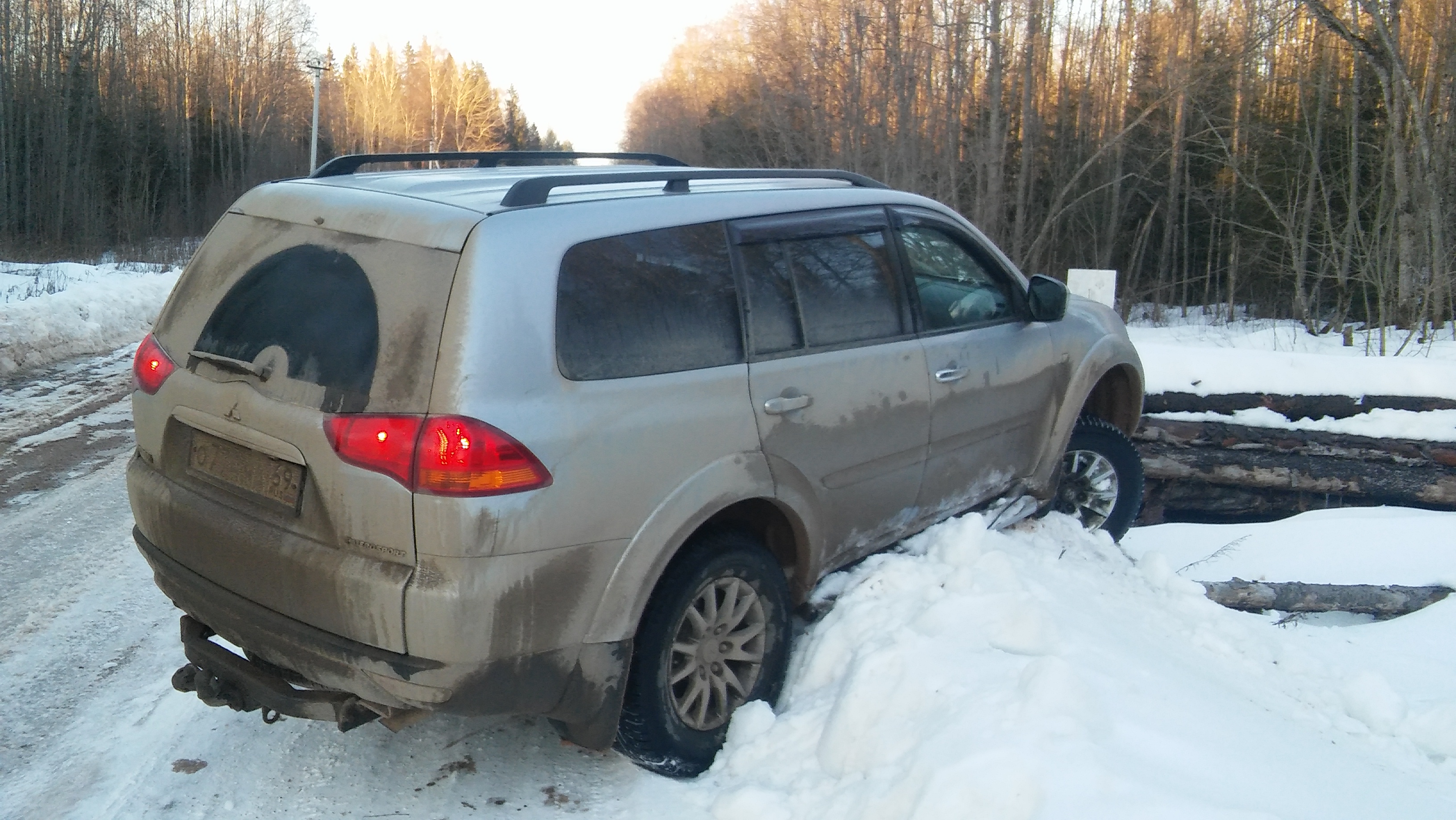 По дороге в деревню в ледяной колее зад решил обогнать перед (скорость то была 50 км/ч), вот так перпендикулярно дороге чуть не достал до бревнышек - заледенелый бруствер снежный спас....