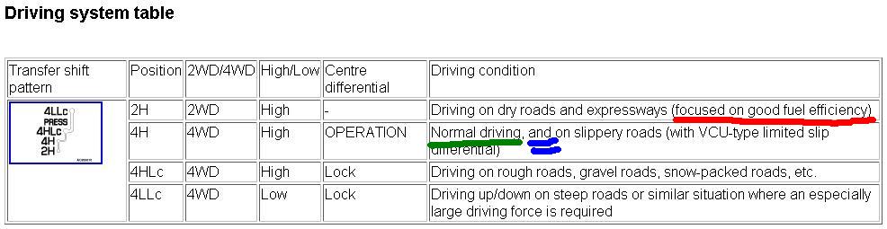 Вот, скажем, ты пишешь, что 4Н можно использовать и на сухом, и на скользком. А я тебе скажу, что следует его использовать всё же на скользком, а на сухом - можно, но это приведёт к ненужной и лишней работе элементов трансмиссии и их повышенному износу (и это универсально для любого подобного авто, что бы там ни стояло - вискомуфты, торсены-шморсены, и прочее - когда передний мост включен и они работают без надобности, они изнашиваются). Гы.