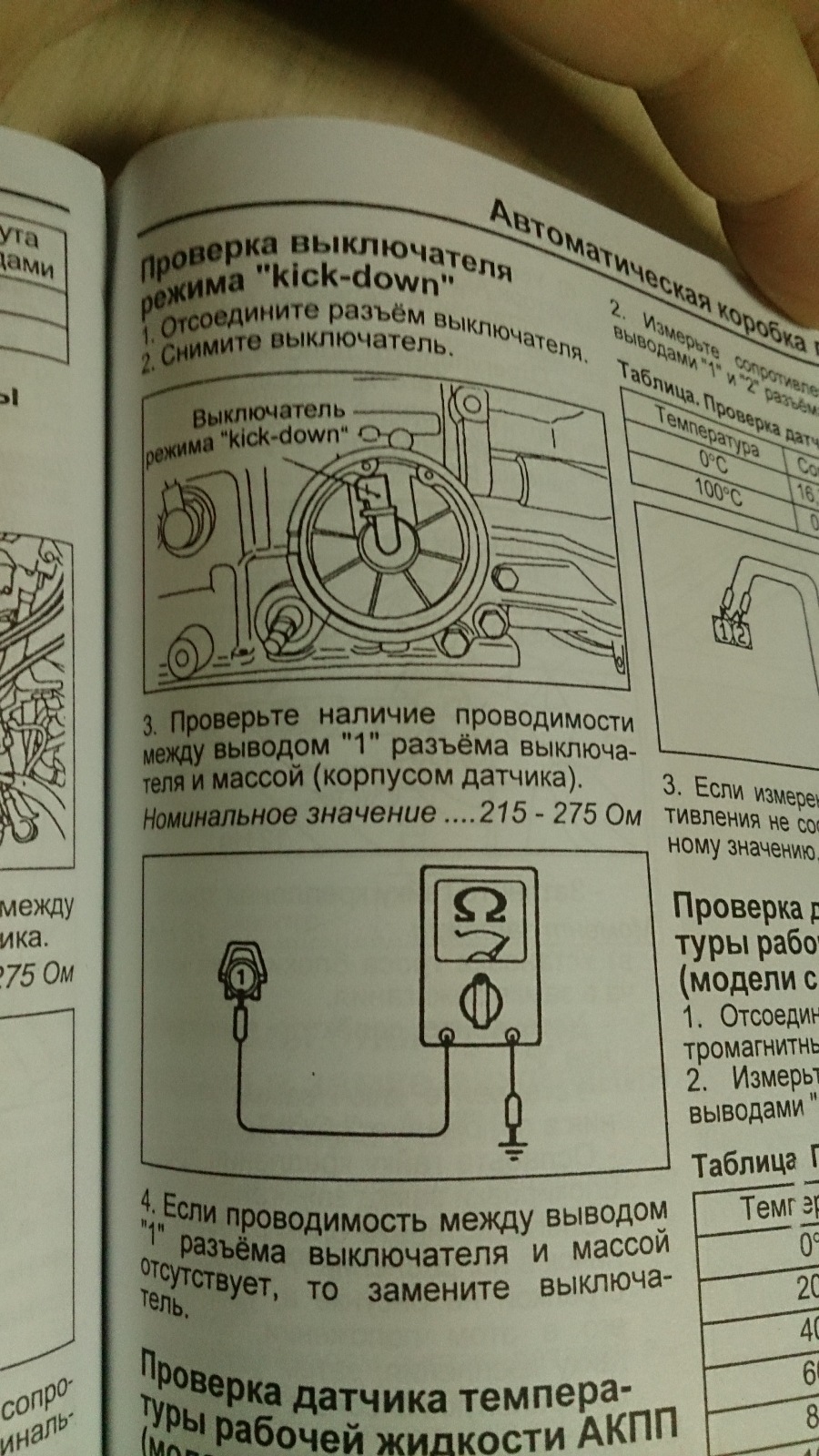 Вот что у меня в итоге получилось намерять с выключателем "Кик-даун". Сопротивления ноль, пока не нажать железку, но и после нажатия сопротивление никак не соответствует тому что указано в книге....На картинках подробнее. Может у кого-нибудь есть разобранная коробка, чтобы можно бы сравнить... Или забить на это несоответствие и все....