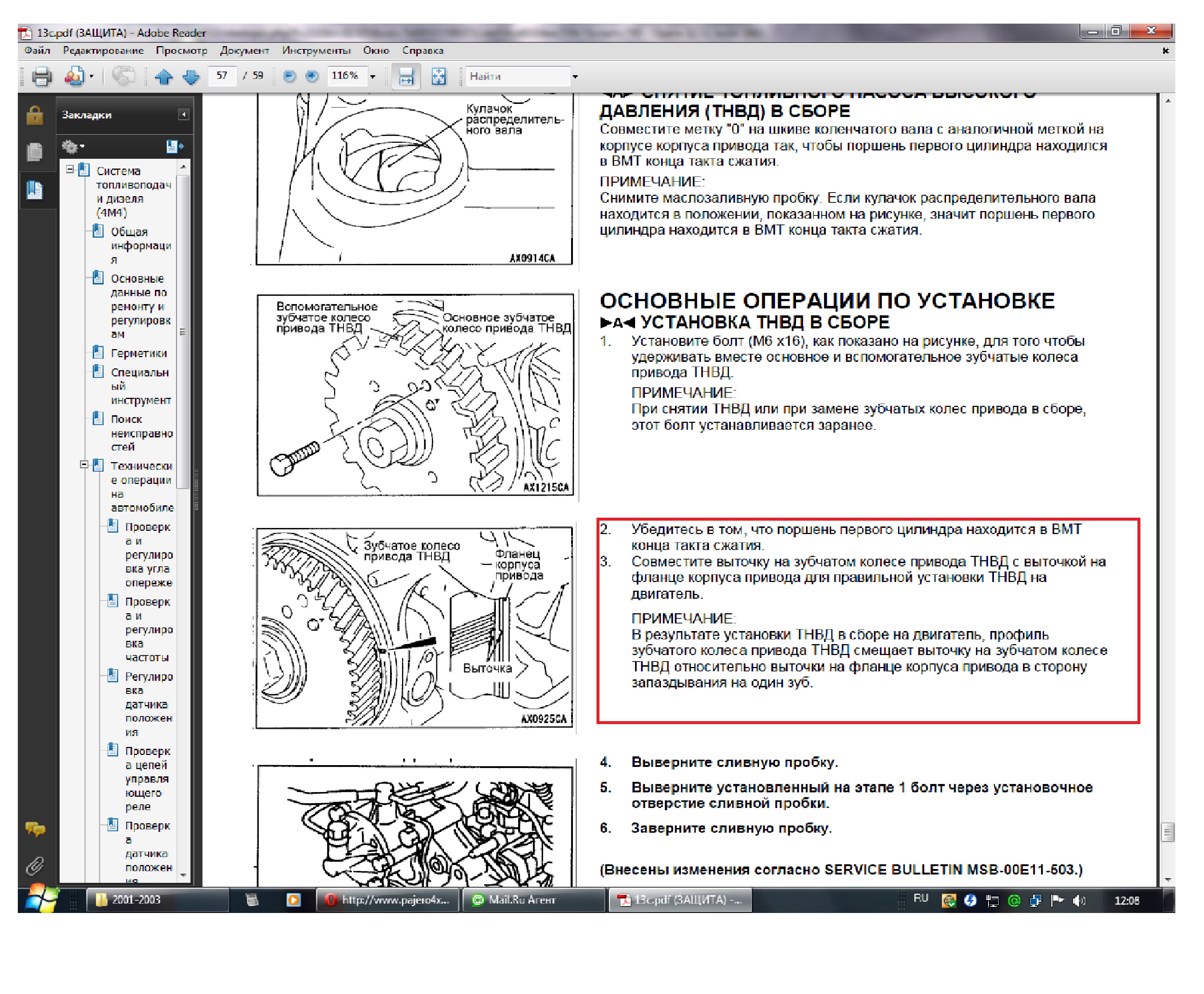 Да все верно в мануале так и есть, я же еще на зуб вперед выставил!!!!!!!!!!Vitalya-74 писал(а):Вы что то не так прочли в мануале или у вас такой "кривой" мануал. Ставить надо как я написал. Метка в метку и она сама уходит на зуб.Lысый писал(а):в мануале же четко написано двигатель 4м41 при постановке на зуб преред,так как зуб косой он потом смещается на 0/0Vitalya-74 писал(а): На шкиве метка ставится "0", на ТНВД метка в метку, а потом из-за косого зуба при постановке она сама уходит на зуб ниже.