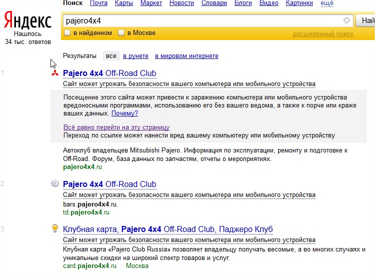 при запросе в строке яндекса "pajero4x4" все страницы открывать не рекомендует.