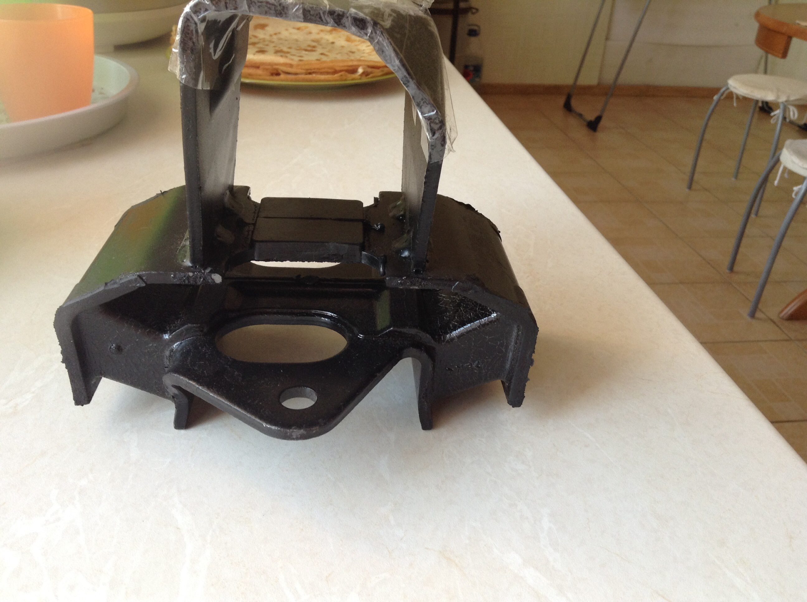 Поставил подушку. Поставил ограничитель (мой еще живой вполне был, но подразбитый). Не обошлось без приключений. Когда залез подушку менять - одного болта уже не было, второй был полуоткручен. Когда попробовал закрутить болты, понял, что резьба слабая и ее сорвет. Причина - когда высверливал старые болты и нарезал М12 вместо М10 - немного разбил отверстие. Кроме этого новые болты взял короткие на 30 мм. Расстроился. Купил даже метчик М14х1.25. Но потом промерил глубину - почти 45. Резьбу я нарезал до конца, точно помню. Короче болты на 45 мм. и все встало без проблем. На днях проверял - болты не месте.
