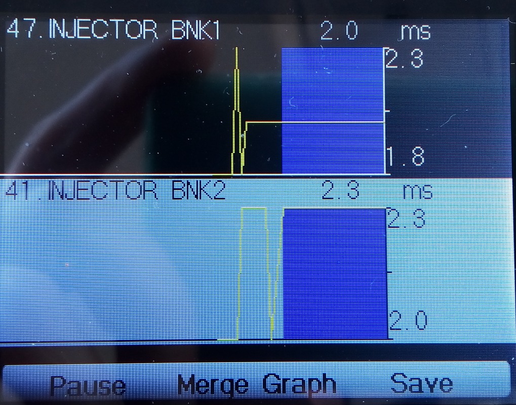 2) Немного уточняю, как мне сказали официалы: "не меняется угол опережения зажигания при изменении оборотов" - это значит, ЭБУ работает в аварийном режиме, что может, причина в нём. Как можно проверить что ЭБУ не глючит, что мозг не свихнулся? Потому что механик говорил, несмотря на ошибку Р0305, свеча в 5 цилиндре - светлая, а в 6 - чёрная. По сканированию видно, что коррекция по головам такова: левая льёт, правая - нет Время открытия форсунок слева всегда заметно больше, сем справа, вот свеча в 6 цилиндре и чёрная. Значит. ЭБУ даёт такую команду форсункам, что у него там за глюк? Вот фото графиков - injector BNK 1 BNK 2.