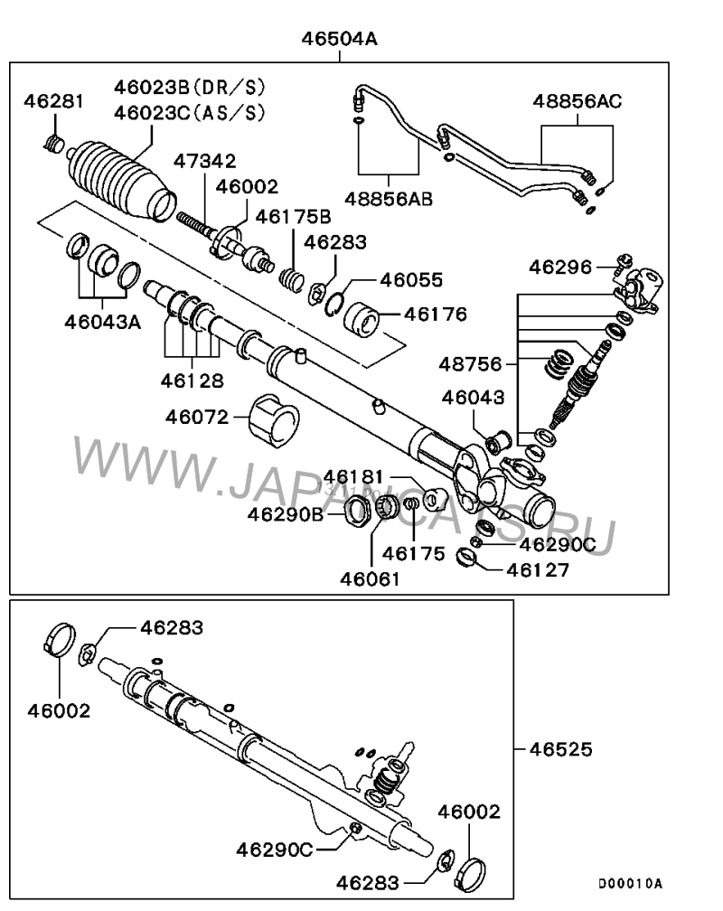 Рейка стучит только на перездах аж в руль отдает, менял и втулку в рейке и наконечники и тяги и подтягивал - один фиг есть стук, пока на днях у знакомого на подъемнике машину за заднюю часть подрамника не вывесил и начал колеса туда сюда крутить, оказалось что сдохли сайлент блоки крепления рейки к подрамнику при повороте колеса сначала рейка двигается, а потом только тяга. Отсюда и стук у меня. По рисунку выше номер сайлента 46043.