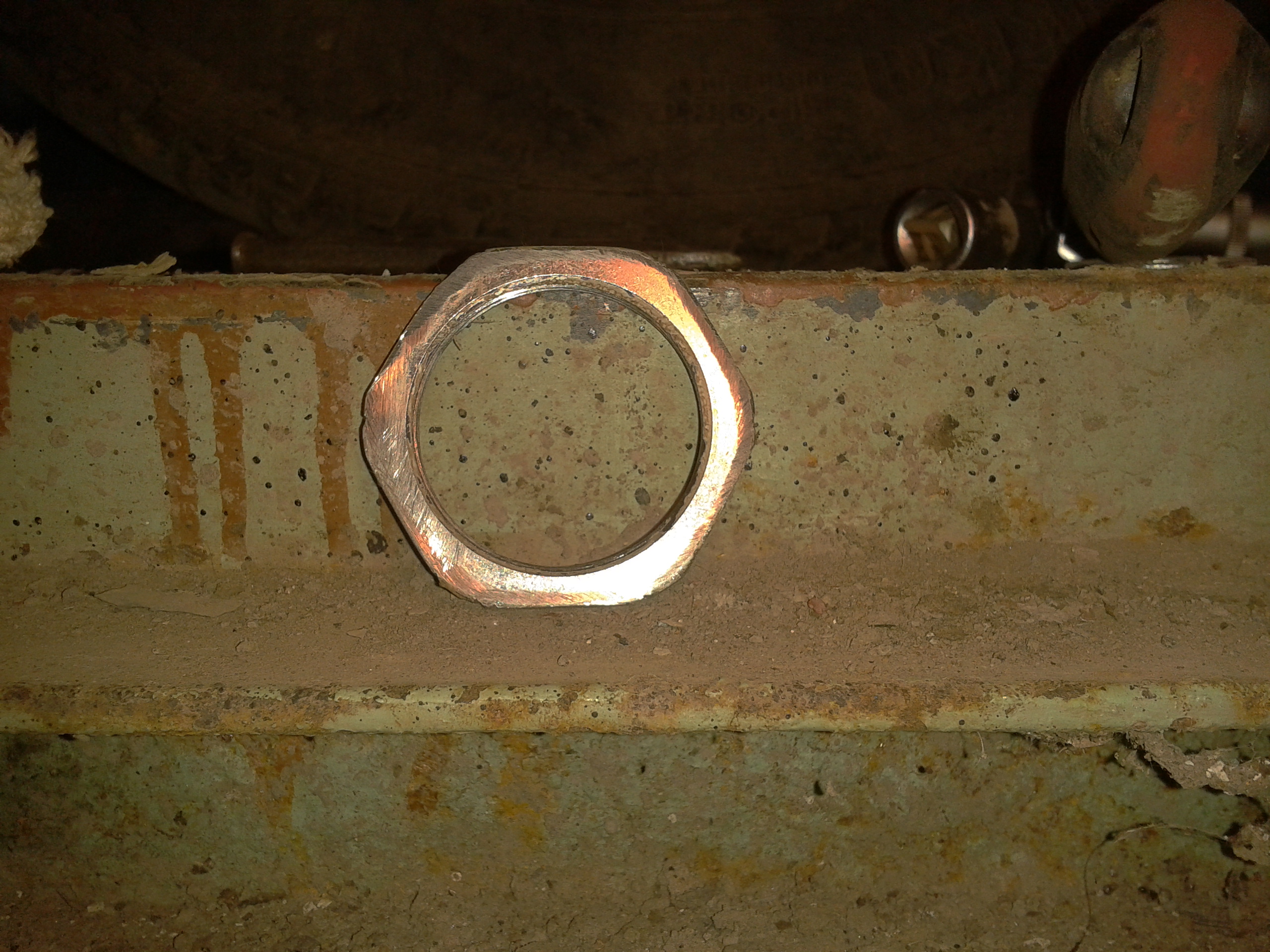 2. Пока ослаблял гайку зубилом и отверткой она превратилась в розочку. Снял чтобы придать ей вид гайки на наждаке. Потому что люблю когда розы это розы, а гайки это гайки. Снял чтобы замерить для изготовления ключа. Снял чтобы намазать герметиком так как сорванный держать не будет.
