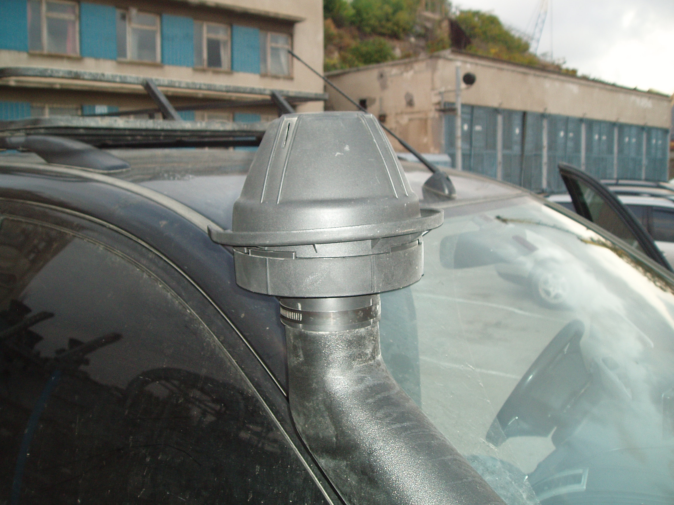 В воздухозаборнике, снизу перемычка, непускающая воду внутрь, перед ней сливные отверстия. На воздухозаборнике сетка, так что листья и т.д. не засосёт.